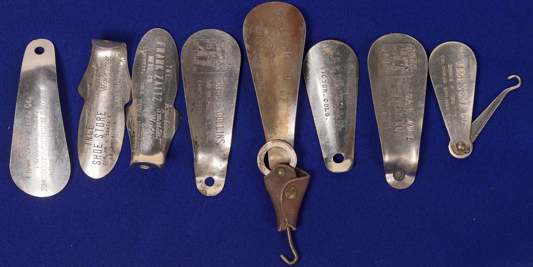 8 rare Colorado metal shoe horns. Colorado Springs, Victor, Leadville, Canon City, La Junta, Denver.