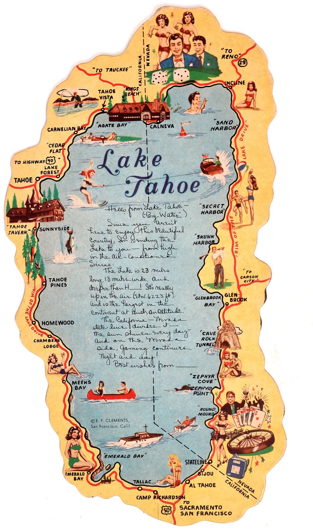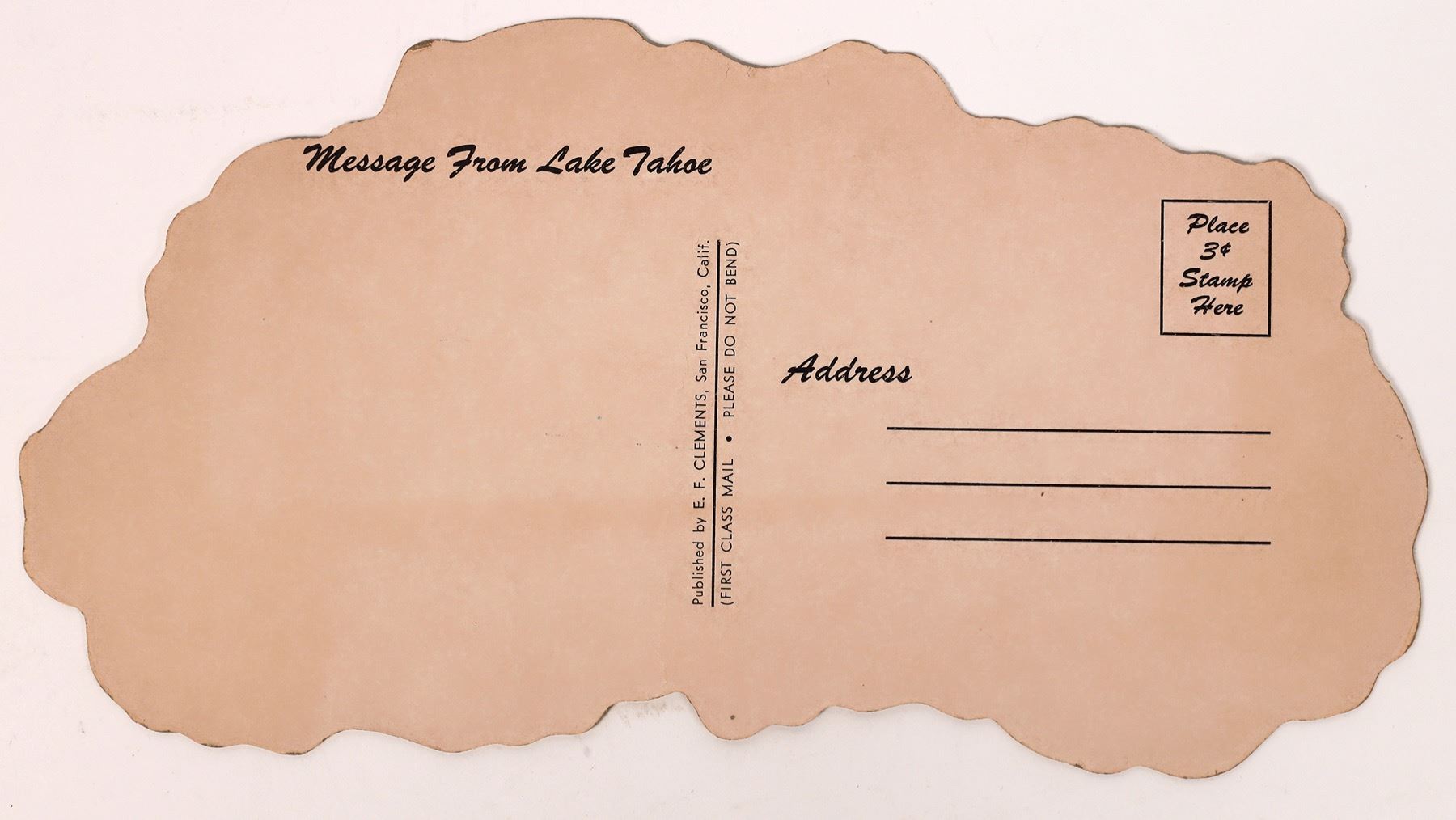 We have not come across one of these in the hundreds and hundreds of Tahoe postcards we've handled before! Colorful die-cut postcard in the shape of the lake, printed on cardboard by EF Clements, San Francisco. Not mailed, but c. early 1950s. Highlights all of the tourist locations arund the lake with little illustrations. 8.5 x 4.5"