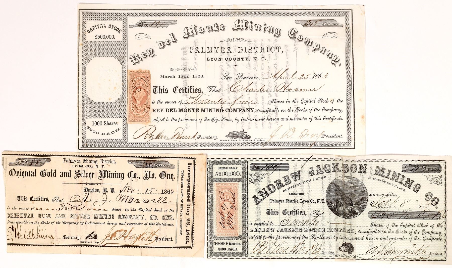 1) Rey del Monte MC Stock.Dateline San Francisco. Early number 12 for 25 shares to Charles Hosmer. Signed by R. N. Van Brunt and president JD Fay(?). Hosmer was a San Francisco mining stock broker. On September 29, 1860 he purchased 20 feet of the Copperas Tunnel claim. Used a promissory note dated April 1, 1861 to secure it. This shows a definite Nevada connection. The area was still in the Utah Territory at this time. [Records of Carson County, Utah and Nevada Territories by Ellison]. Incorporated March 18, 1863. Not cancelled. 25c Protest revenue stamp. Location: Palmyra District, Lyon County, N. T. Towne & Bacon printer. Nicks along borders. Dog ear upper left. Overall very nice. The Sacramento Daily Union reported on December 12, 1862 (four months before incorporation) that the Rey del Monte of Palmyra is "yielding rock of extraordinary richness." The ore shows plenty of free standing gold and silver. And the "owners are industriously engaged in raising ore from their mine for crushing next spring." The Palmyra district, which included the towns of Palmyra and Como, was organized in 1862 in the Pine Nut Mountains 8 miles southeast of Dayton between the Sullivan (to the southwest) and Indian Springs (to the northeast) districts. [Nevada Mining Districts by Tingley]