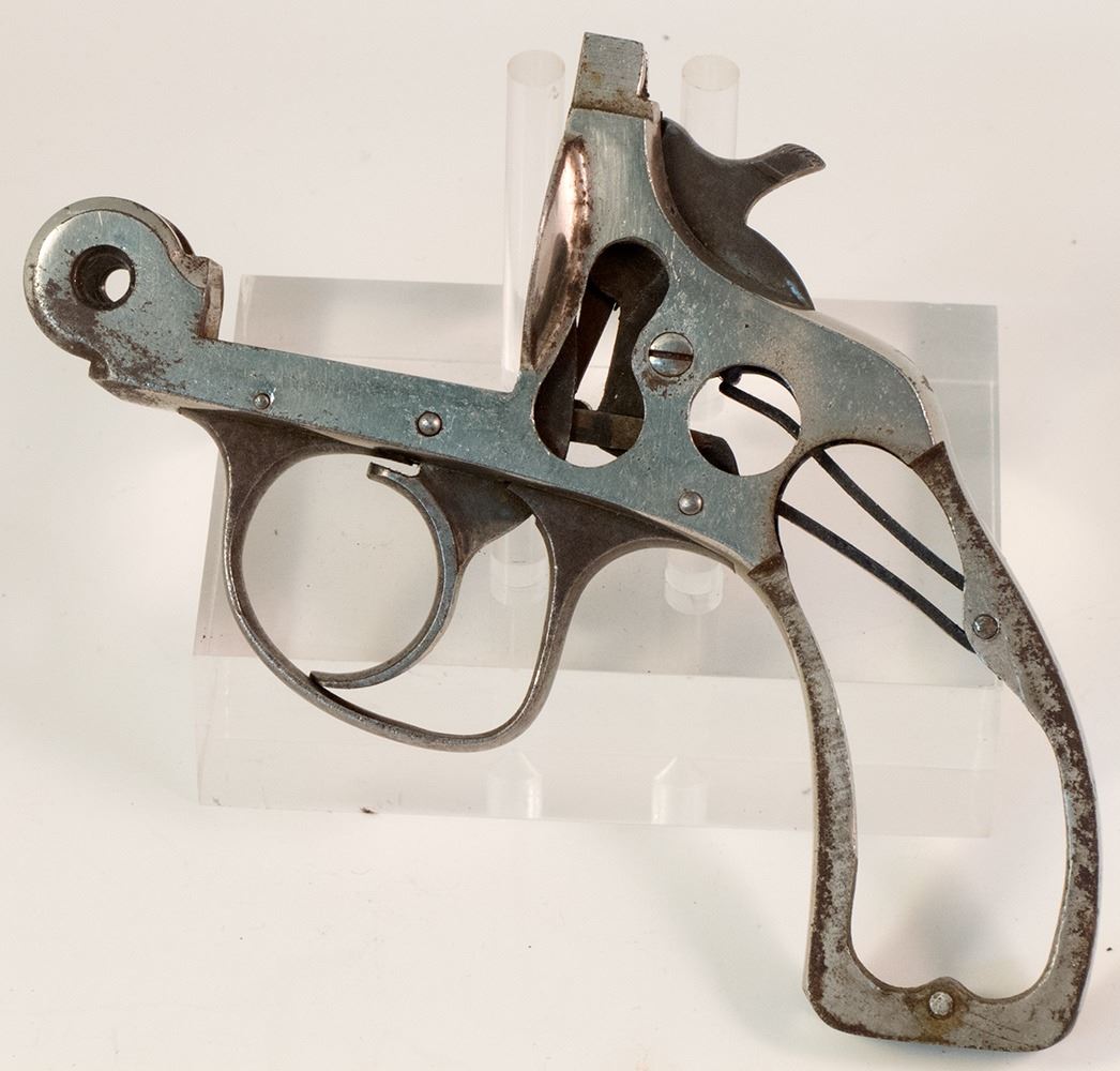 Rare break top double action factory cut-away frame for a double action pistol. Nickel with blue trigger guard. Case hardened hammer and trigger. State: City: Date: FHWAC#: 39804