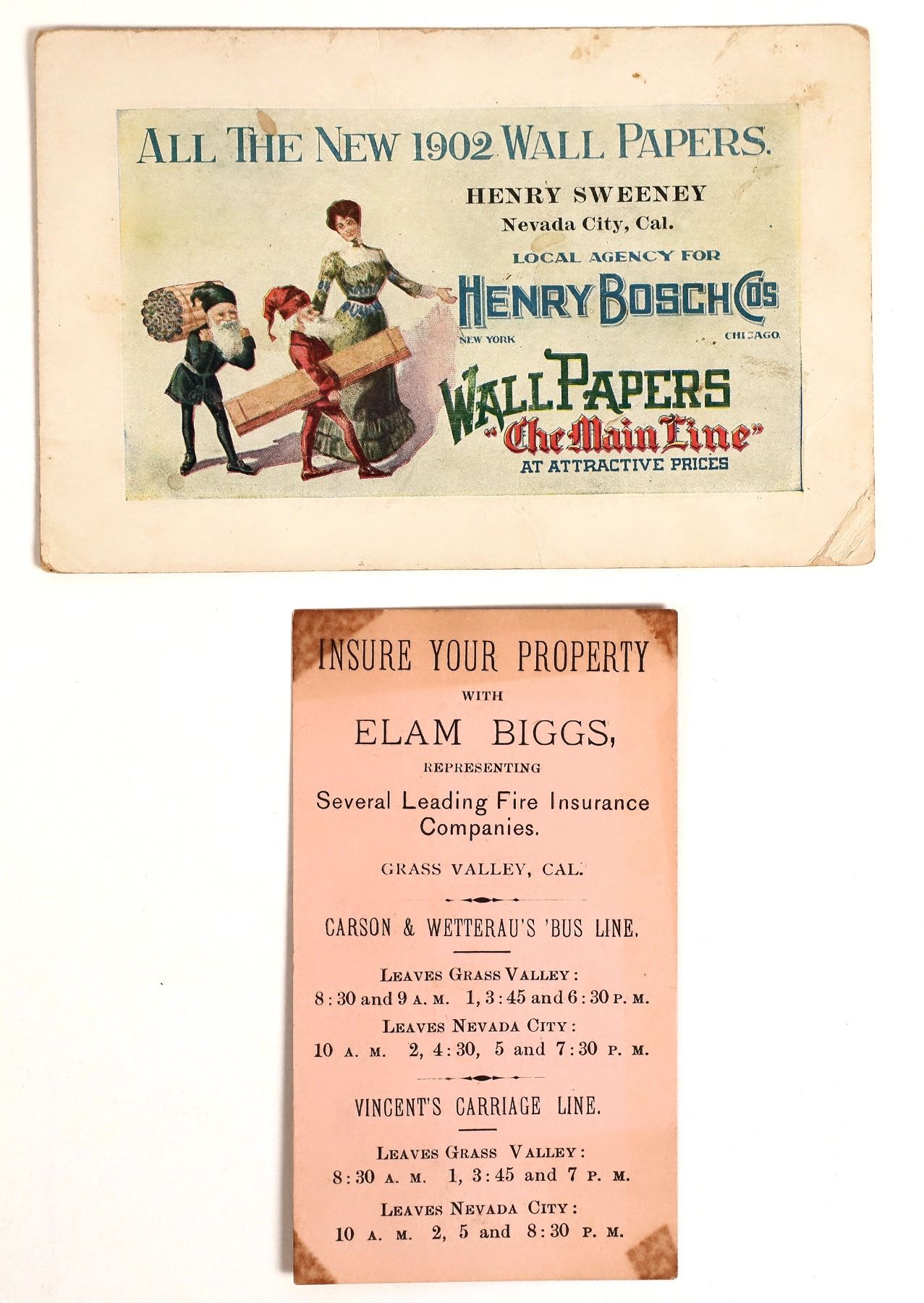 Nevada City & Grass Valley. 2 rare early business cards, c. 1900-15. Pink Elam Biggs fire insurance, Grass Valley, CA 4.5x2.5" corner toning. 1902 color Henry Bosch wall papers, 3.5x5.25"corner crease, some toning.
