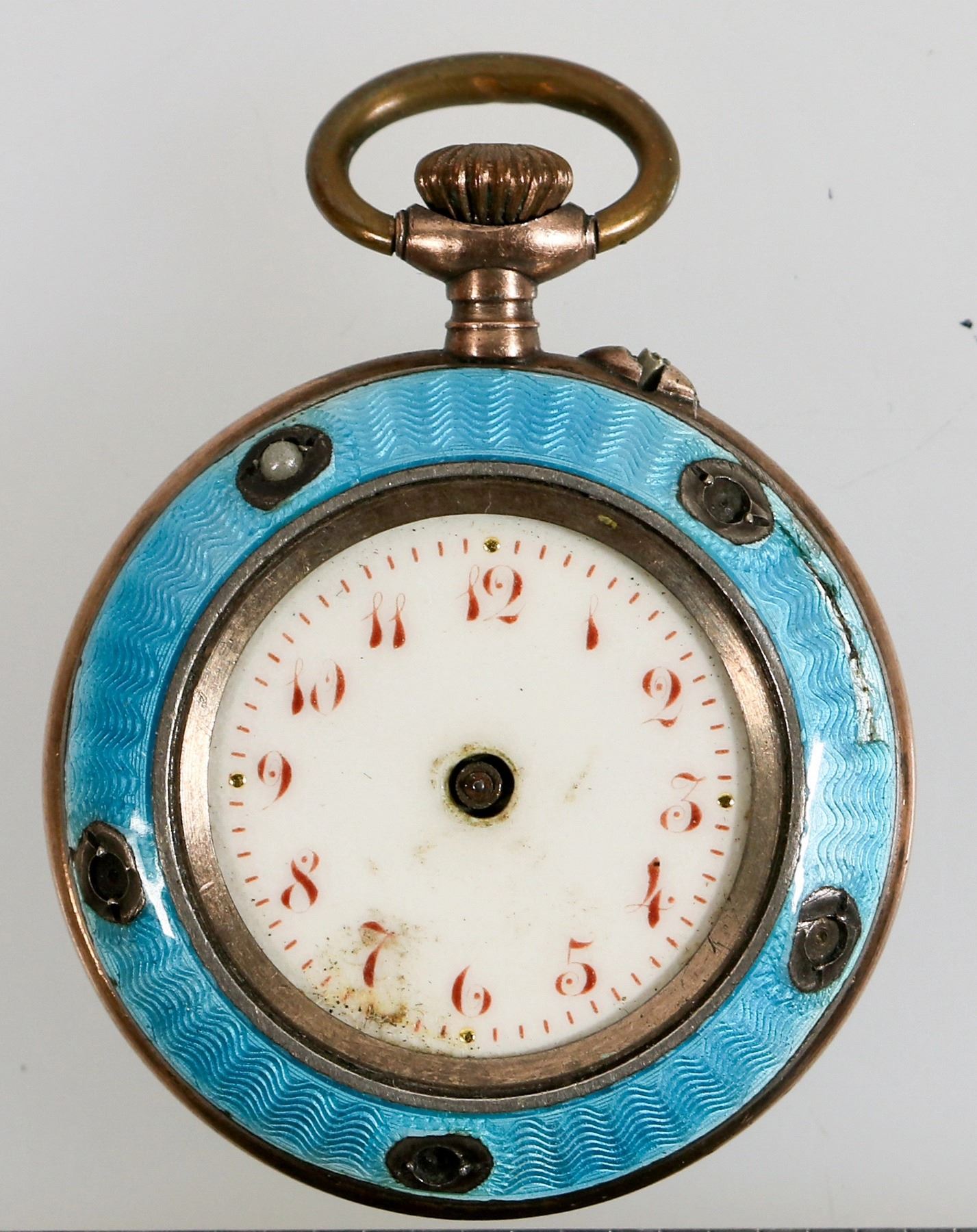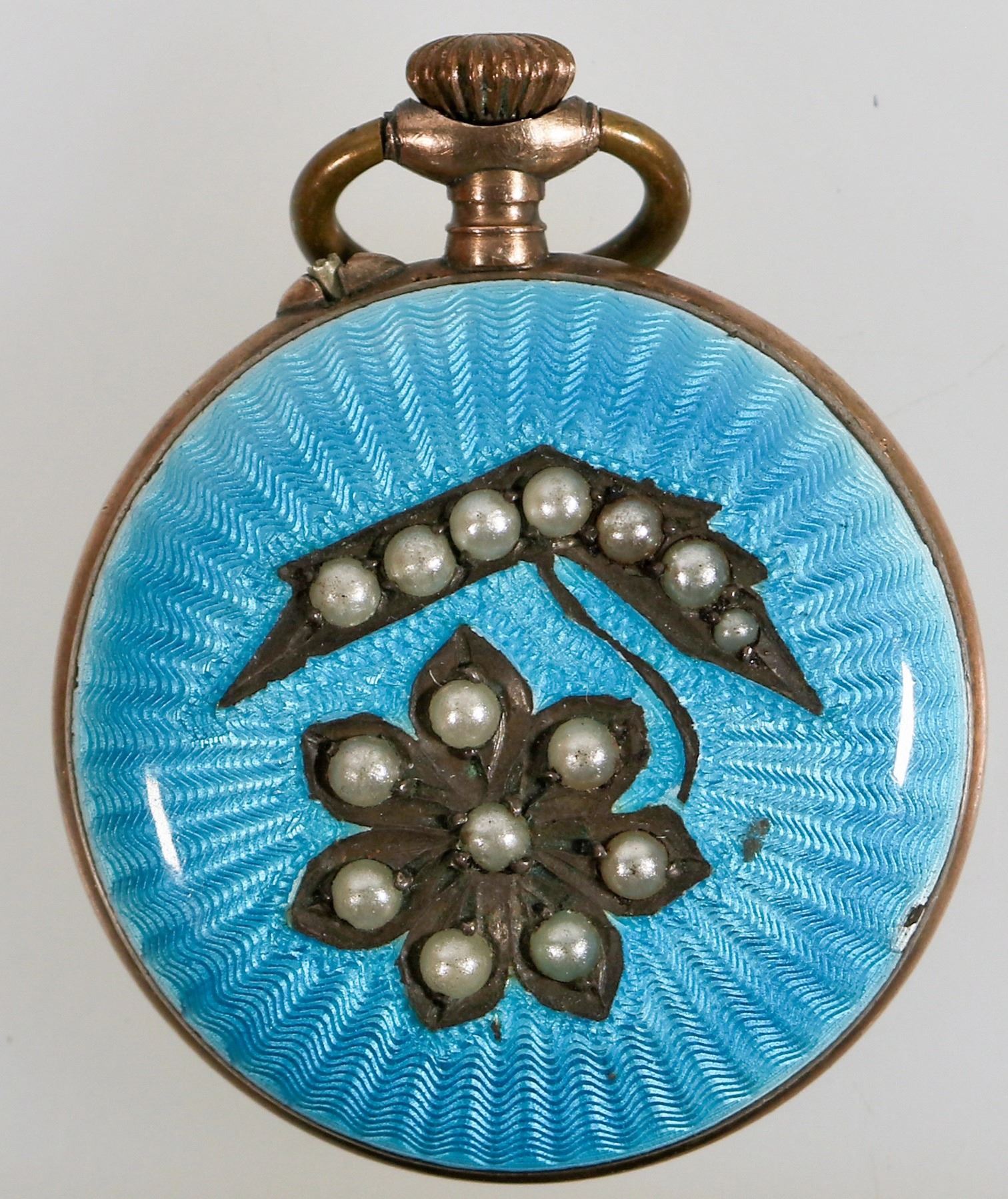 Very small, very ornate enameled and jeweled pocket watch. This tiny wonder measures just 1" in diameter. Please note this piece needs work, and we did not open it up. There are no hands, no glass on the face, and some wear to the enamel surfaces. The ornate work in the blue finishes is amazing, however. This piece has large potential, please inspect.