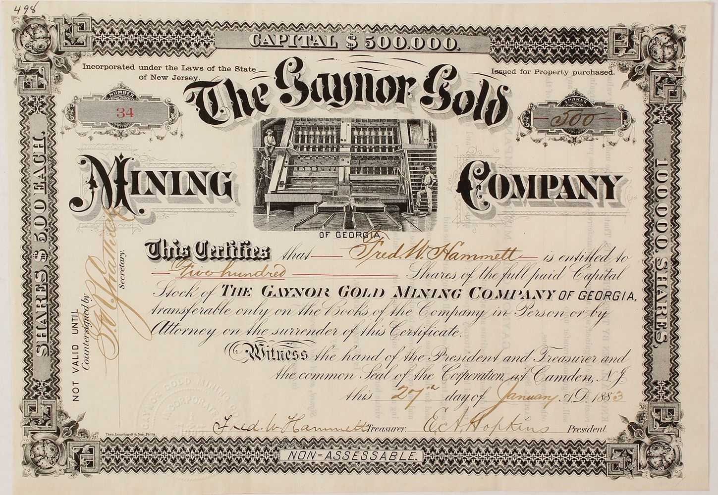 This Gaynor Gold Mining Company of Georgia stock certificate is number 34 for 500 shares issued to Fred W. Hammett on January 27, 1883. Signed by president E. A. Hopkins and treasurer Fred W. Hammett. The company was incorporated in 1882. Unusual vignette of the inside of a stamp mill. No edge issues, discoloration issues, rips, tears, pin holes. This is truly an extra rare stock that is in extra fine condition! (Al Adams Gold Rush Memorabilia Collection) Date: 1883 Location: Georgia HWAC# 56953