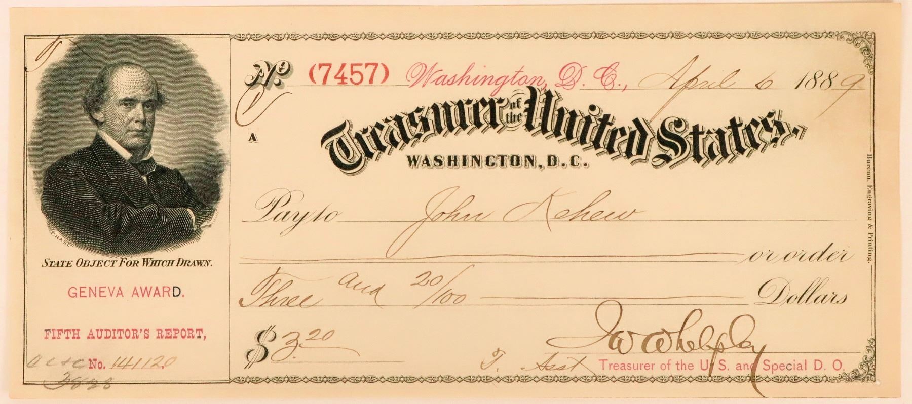 This is an Alabama Claims U.S. Treasury draft issued in 1889 payable to various Americans for their losses as a result of attacks by Confederate raiders by the ships Alabama, Florida and Shenandoah, built in the United Kingdom. These drafts were made from the $15.5 million Geneva Award, in which the U.K. agreed to pay reparations to the U.S. as they were partly liable for building these ships for the Confederate States. The vignette at the left is of Salmon P. Chase. The Geneva Award was the first agreement of it's kind between sovereign powers and was a precursor of the World Court and the United Nations. The check was issued to John Kehew for $3.20 and signed by J.W. Whelpley, first asst. Treasurer of the United States. In excellent condition.