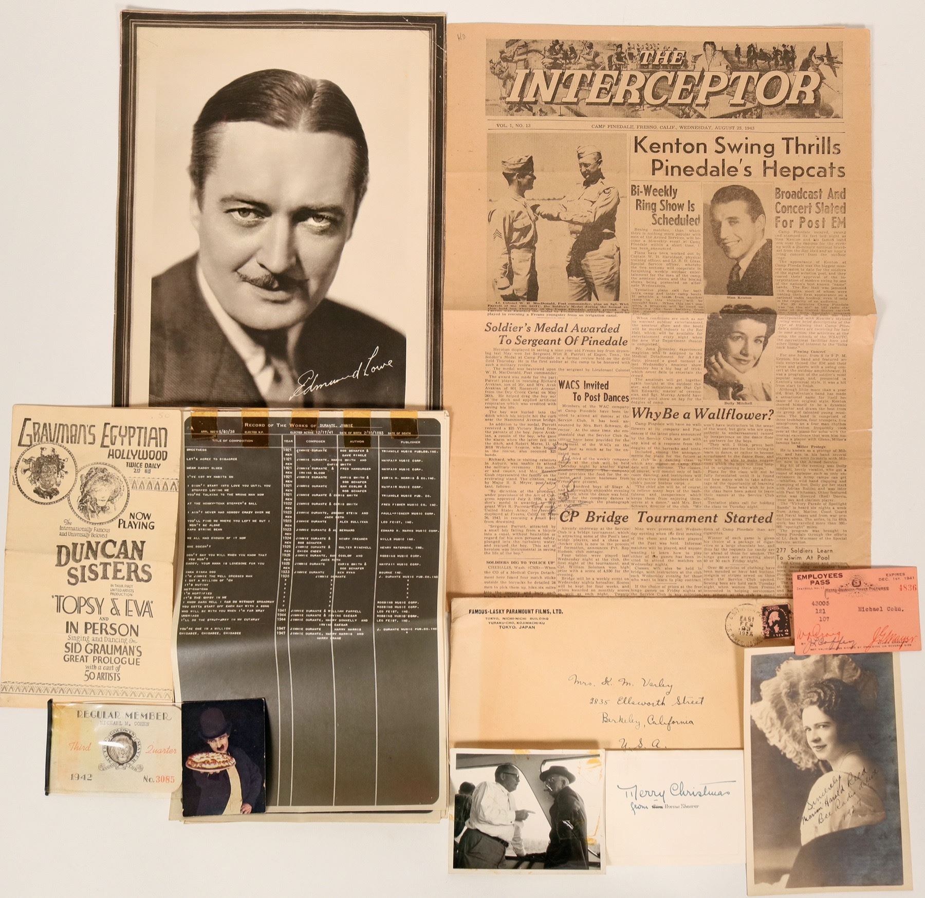 Lot of 11 includes some rare pieces of Hollywood history that will appeal to the fan of movie studios in the '40s. It includes an employee's pass for entrance onto the Metro Goldwyn Mayer lot, signed by Louis B. Mayer's brother, Studio Manager J.G. Mayer, that expired Dec. 1, 1941; MGM Studio Club membership card, signed by W. Craig, club president; Merry Christmas greeting from Norma Shearer, which appears to have been written in her own handwriting; 3 x 2 1/4 inch colorized photo of what appears to be a Charlie Chaplin impersonator; black and white candid photo of Jimmy Durante and five page Xerox copy of musical compositions by Durante; autographed photo of "Marion" Harold Reed, Bee Radio Artist, 1927; program for "Topsy & Eva," starring the Duncan Sisters, Rosetta and Vivian, at the Grauman's Egyptian Hollywood Theatre; Wax sealed cover from Famous-Lasky Paramount Films, Ltd., Tokyo, Japan, canceled in 1927; 12 x 9 inch photo with what appears to be a printed autograph of Edmund Lowe, whose career included over 100 films in which he starred as the leading man; and 1943 copy of "The Interceptor" Camp Pinedale, Fresno, CA, newspaper, in which there is a story about American popular music and jazz artist Stan Kenton and his band performing at the military base.