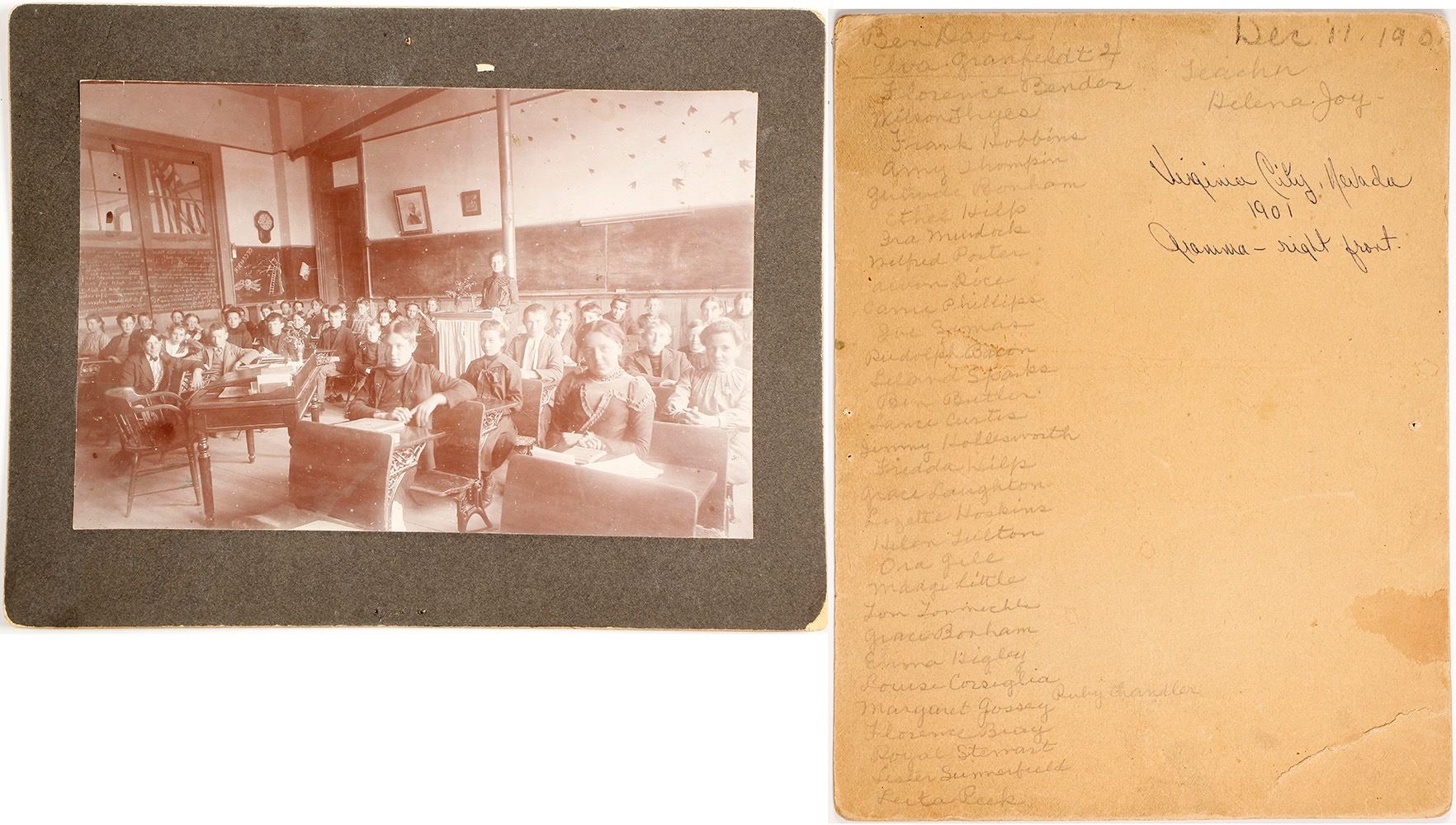 Mounted sepia photograph (4.5 x 7" on 6.5 x 8.25" board) showing school children and teacher in classroom. Reverse has pencil and pen notations that appear to identify most of the students and the teacher (Helena Joy) and is dated Dec 11, 1901. "Gramma" is seated right front. Medium contrast. Some wear to board. Provenance: Ayer Family Estate. Please see other Virginia City, Gold Hill, and Reno photographs from this family collection. Date: c.1901 Location: Virginia City, Nevada HWAC# 55524