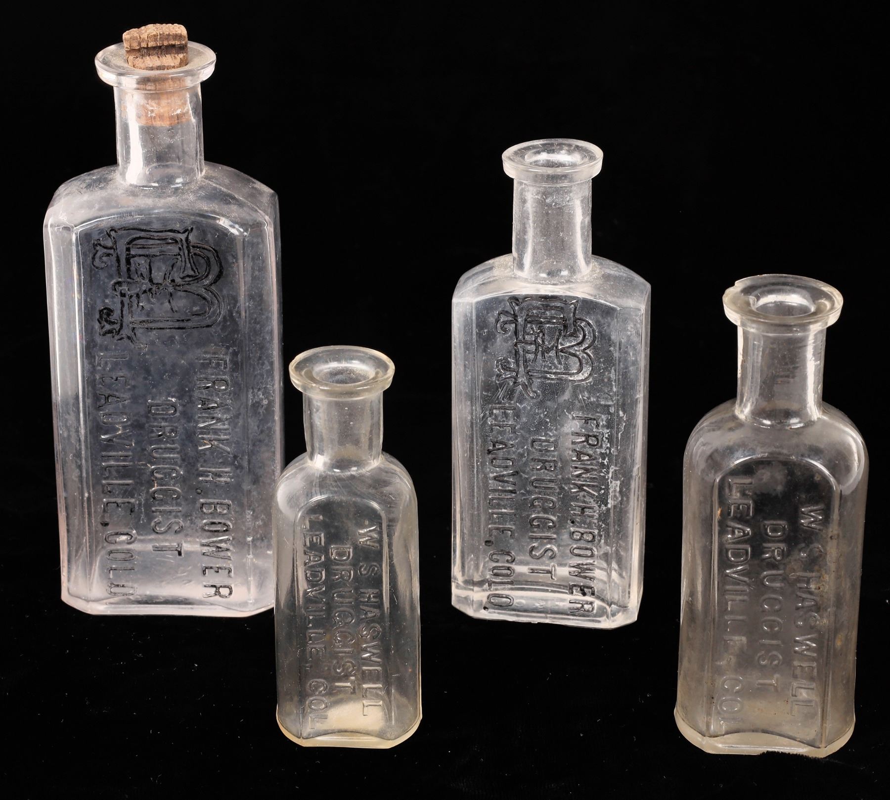 4 rare Leadville medicine bottles. Embossed-R3 W. S. Haswell/Druggist/Leadville, Col. 3.5"-lip ding, and 4"-.25" lip chip. Black embossed R4 Frank H. Bower/Druggist/Leadville, Colo 4.5"-1" front base chip and 5.25" with partial original cork. No other apparent chips or cracks.