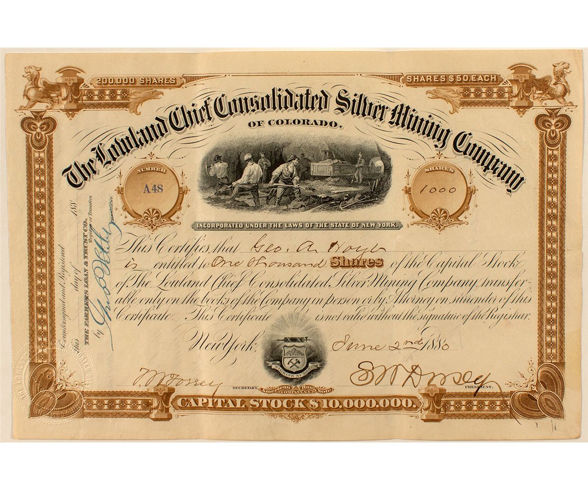Issued in 1880 for 1,000 shares, number A48 to George A Hoyt. Signed by M. Forrey, secretary, and SE Dorsey(?). Early! Nicely etched brown border with a center vignette of working miners.City: County: State: CODate: