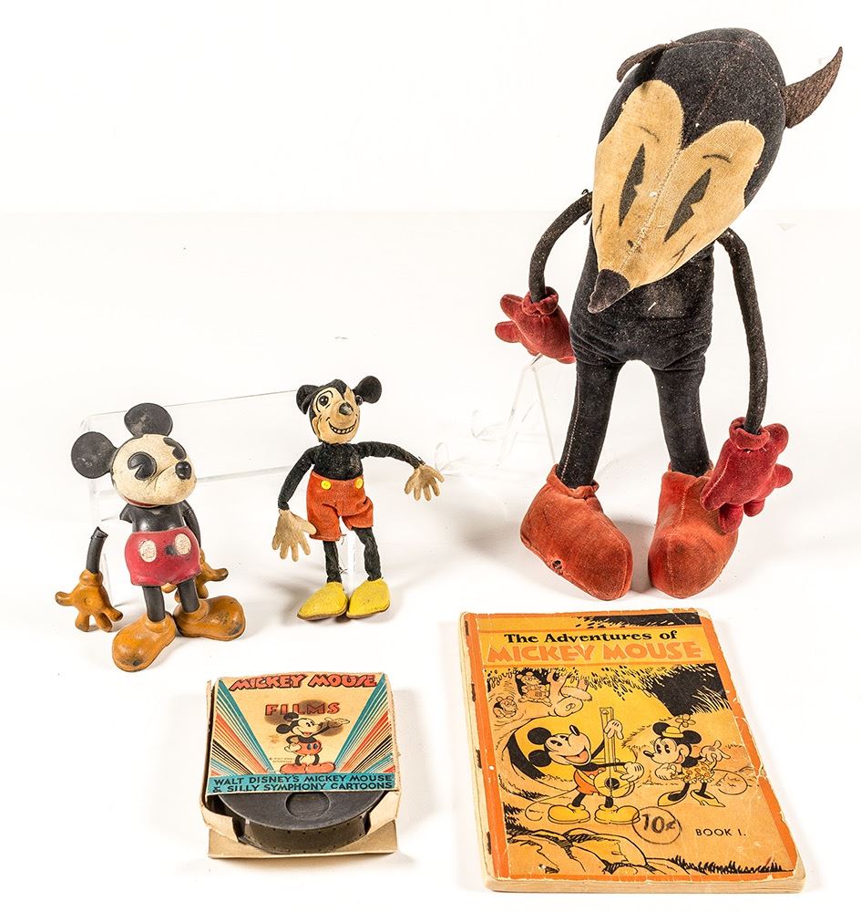 Truly fabulous collection. 1) A very early, very rare Mickey Mouse 15" tall stuffed velveteen doll, from a time when Mickey really looked more like a rat! Incredible collector's item. Face is drawn on. Condition good, head a bit loose from neck, wires in shoes pokng out a bit. Possibly by Charlotte Clark. 2) A 1920's Dean's rag book. Mickey mouse made from velveteen material covering, shorts, hands shoes, and ears. Fitted to the shorts are four small yellow plastic buttons. Mickeys face features a toothy grin (correct with the time) over-sized ears and shoe button eyes. A fantastic, highly collectible item and very hard to find. A toy with age related wear, missing his wire tail. Even after all of the negative points that have been mentioned, you will see that actually this is still a lovely rare vintage toy and a must for serious Disney collectors. 3) Mickey Mouse Films. Silly Symphony is a series of 75 animated short films produced by Walt Disney Productions from 1929 to 1939. As their name implies, the Silly Symphonies were originally intended as whimsical accompaniments to pieces of music. As such, the films usually had independent continuity and did not feature continuing characters, unlike the Mickey Mouse shorts produced by Disney at the same time. 4) Very old, hard rubber 6" Mickey Mouse figure. Moveable head.One arm broken off, but in package. 5) The Adventures of Mickey Mouse, Book 1, 1931. David McKay, 1931, Philadelphia. Pictorial Cover. Book Condition: Good. Walt Disney Studios (illustrator). The one that began the Disney empire.Story and illustrations by staff of Walt Disney, no pagination, book bound in color pictorial paper over boards, color illustrated throughout; light wear at extremities, Size: 8.25" x 6". City: State: Date: Early 1900's hwac# 33577