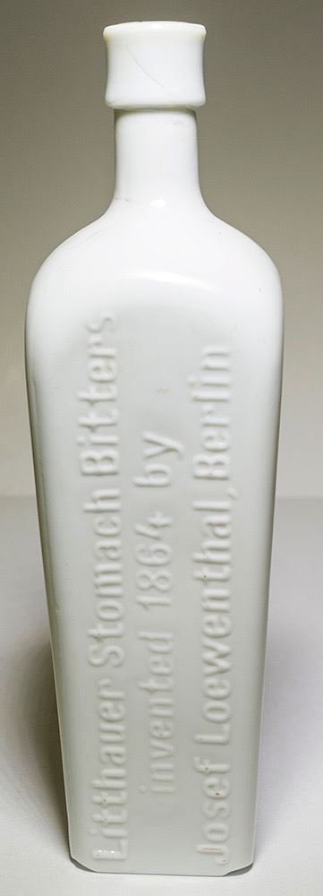 The S. Loewenthal Co.'s son Joseph of Cleveland, Ohio became the sole manufacturer of Litthauer Stomach Bitters. Rare L102 milkglass. Litthauer Stomach Bitters / Invented 1864 by / Joseph Loewenthal, Berlin. 9.5". Pretty bottle, no visible cracks or chips. Date: Location: HWAC # 54673