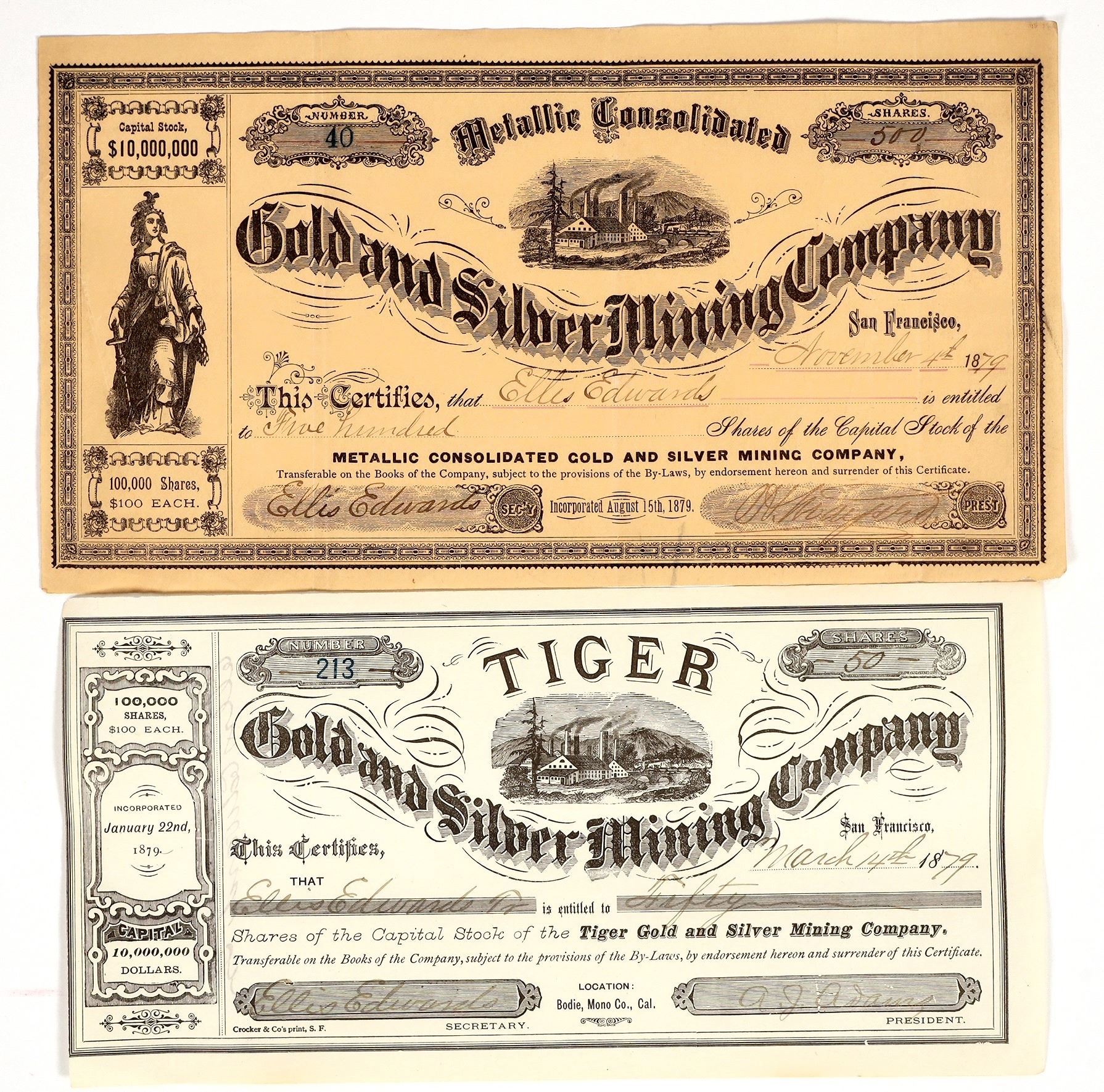 Lot of 2 rare Bodie/Mono County. 1) Metallic Consolidated Gold & Silver Mining Co. 1879, issued to and signed by Ellis Edwards, SF promoter and company secretary. Mine was located in Lake District of Mono County and they had a property in Bodie as well. 2) Tiger Gold & Silver Mining Company, issued to and signed by Ellis Edwards. Ellis Edwards was a key investor and founder in a number of western mining company stocks. Included Gypsy queen in Bodie, South Belvedere 1879, AZ MC 1876, Belmont 1878. An article in SF examiner in 1879 discussed the metallic co operating a mine at Bodie. It did not name the mine. Ellis started in VC in 1871; he was an agent for the Tahoe House and moved to SF about 1875 as a lawyer and later briefly a judge.