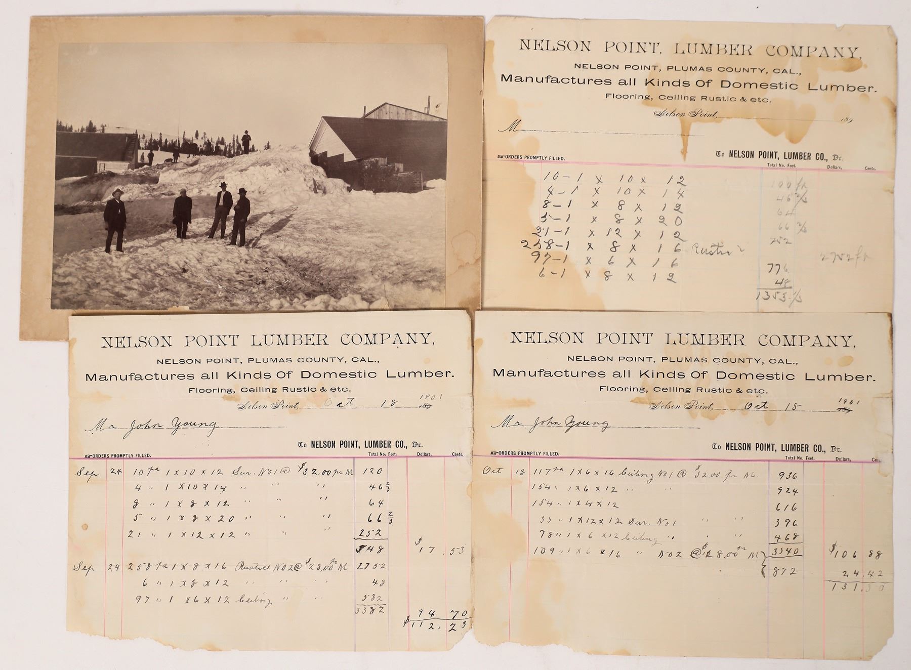 This rare original photograph was taken by Gustave H. Schubert (photographer) at Nelson Point, CA. It measures: 5.75" x 8.5", on thick cardboard paper. It shows a winter scene, several men posing for the picture in the heavily snowed in camp, you can see 2 houses and more people and a small horse carriage in the background. Not dated. Gustave H. Schubert was also a prominent photographer in La Porte. In 1864 he gave out coupons for special offers on cabinet photos and large hand- colored portraits, took photos of main street La Porte and did portaits, even of himself. He operated a photography studio and variety store on Main street from 1880 to1900. [Ref.: ROTM by J.E. Garvis, pp. 70-71] Nelson Point is mentioned in the Feather River Bulletin from 15 Aug 1901, as a close location to a fatal mining accident in Feather River (4 miles south) and it is said to be 11 miles from Quincy. It includes 3x pages of receipts from the Nelson Point Lumber Company, all dated Oct 18, 1901 for good sold in Nelson Point, Plumas County, Ca. This Company was manufacturing " all Kinds of Domestic Lumber: Flooring, Ceiling Rustic etc". Garvis Collection. Nelson Point, Plumas County California