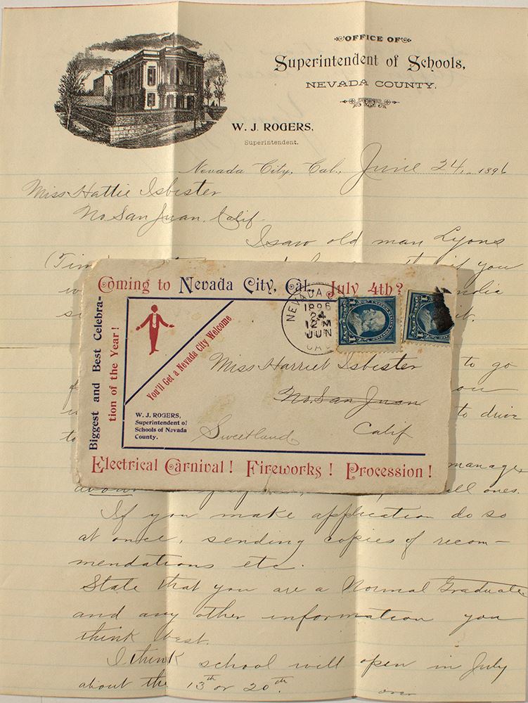 Letter written on illustrated lettersheet for W.J. Rodgers, superintendent of the Nevada City school. June 24, 1896. Writing to Miss Harriet Isbister in San Juan, who he is advising to apply for a teacher position. Salary is $60 and she will have "quite a distance to go from house to school, but [she] swill be given a gentle horse to drive to a cart." Folds with separation. This letter was enclosed in an illustrated cover for the Nevada City 4th of July celebration. Electric Carnival! Fireworks! Procession! Cover torn open at right and some creases around edges.