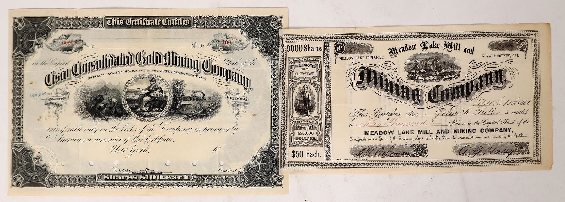 Lot of 2 different. Rare. Henry Hartley settled in Meadow Lake about 1861. There he lived trapping and traveling to Cisco for occasional company. In 1864, he saw gold flakes in the black veins that threaded through the granite rock of the area. He and two friends began mining. By 1865 another company came to the area and began mining as well. The news was out and the rush to Meadow Lake began. Unlike other mining towns Meadow Lake was surveyed and the streets were laid out. The town did not grow simply by chance. The Meadow Lake townspeople had big plans and high expectations, but the camp did not pan out. After leaving Nevada, Orion Clemens (Mark Twain's brother) practiced law there in the 1860s. 1) Meadow Lake Mill & Mining Company. "Meadow Lake District, Nevada Count, Cal." (printed at top). Inc. July 1865. No.61, issued for 200 shares to John A. Hall on March 10th, 1866. Signed by president AG Haley and secretary AH Otheman. Not cancelled. Black border and print, vignette of mill. Printed by GR Crawford, Nevada, Cal. 5.5 x 10" Folds, creases. The company was engaged in a variety of activities ranging from mining interests and the operation of sawmills to the organization of the Meadow Lake Turnpike Company which built and maintained a toll road. 2) Cisco Consolidated Gold Mining Company. "Property Located at Meadow Lake Mining District Nevada County, Cal." (printed under title). Specimen stock certificate (No. 0000), punch cancelled. Mining and allegorical vignette. ABN. 6.75 x 10.5" Folds, small stains. Meadow Lake, Nevada County California