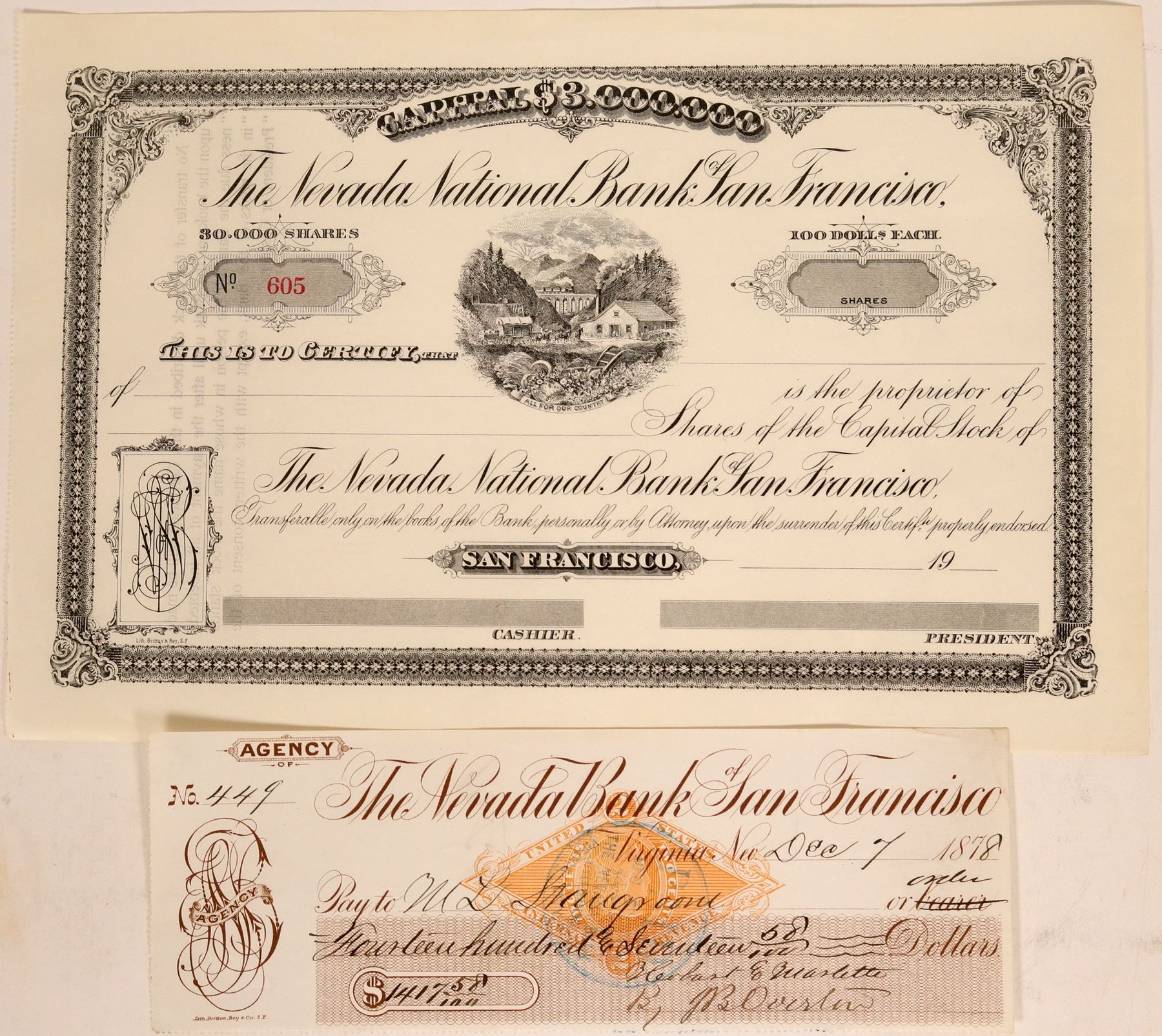 Lot of 2. 1) Unissued ultra-rare stock certificate, dateline San Francisco 19__. Has Comstock vignette with mines and locomotive crossing a bridge. Printed by Britton & Rey, San Francisco. 7.5 x 11.25" This is the first example we've had in 40 years. 2) Nevada Bank of San Francisco revenue check, RN-D, dateline Virginia (City), Nev., Dec. 7, 1878. Issued by Hobart & Marlette (Tahoe lumber company supplying the Comstock mines). The Nevada Bank of San Francisco was created by the Bonanza Firm (Mackay, Fair, Flood & O'Brien) and was their bank to compete against the Bank of California. The bank attained a national charter in the late 1890s.