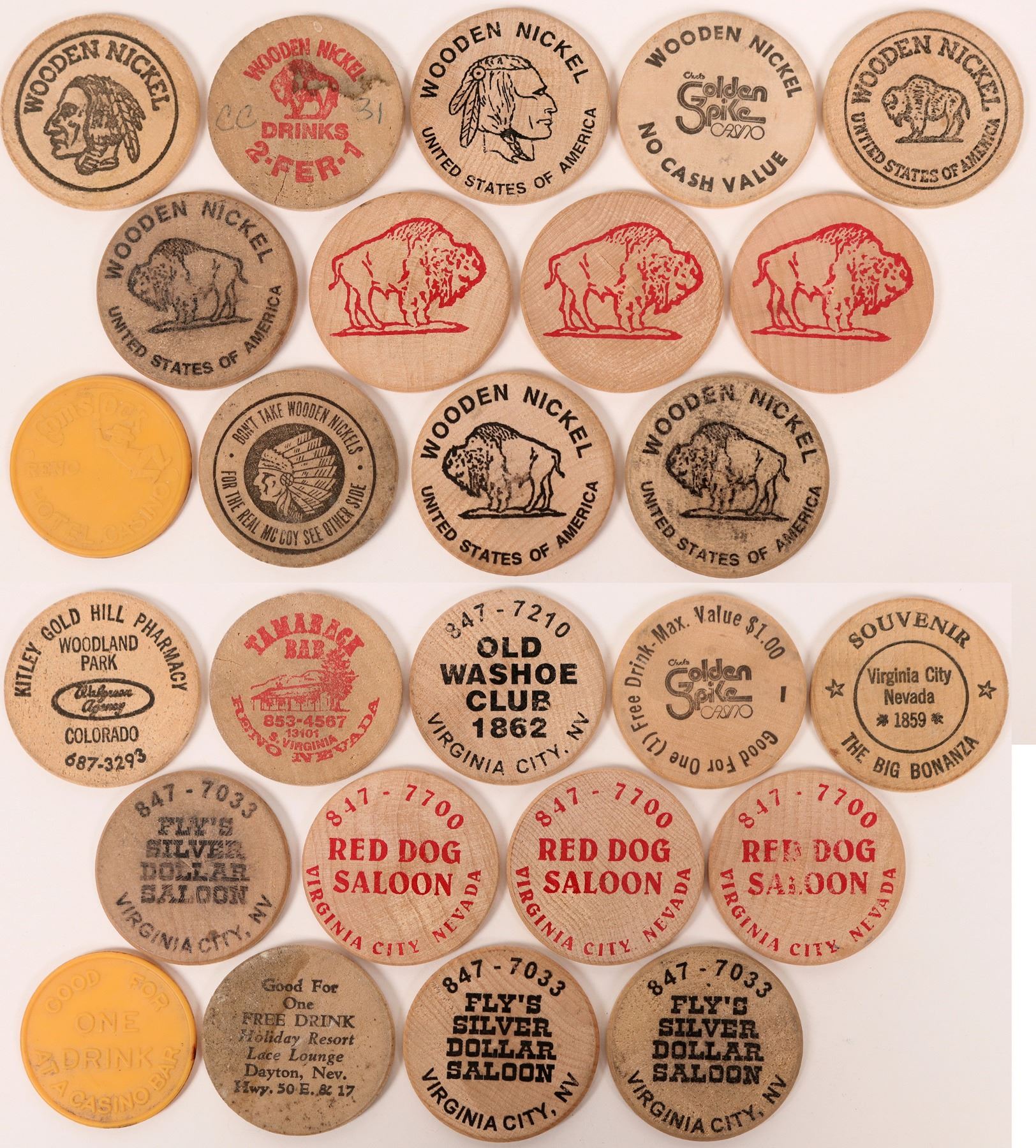 Rare--Virginia City: 3 Fly's Silver Dollar Saloon, 3 Red Dog Saloon, 1 Old washoe Club, 1 Big Bonanza Club; 1 Holiday Resort, Dayton, NV; and three others.