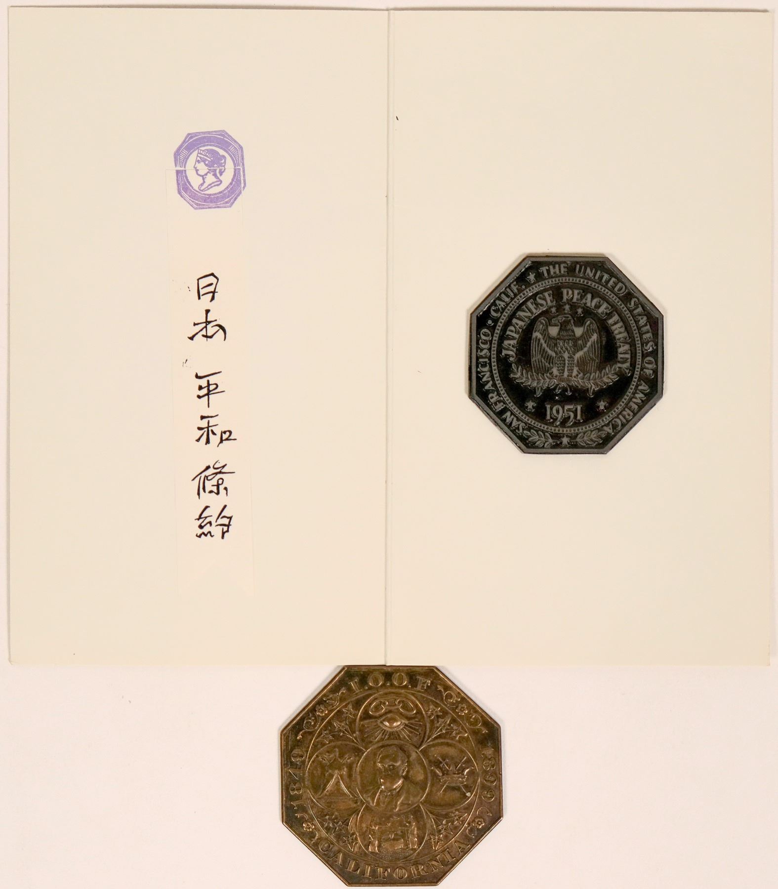 Lot of two medals modeled after U.S. $50 gold slugs. 1) 1899 I.O.O.F. medal. 1849-1899 / California. Bronze, octagonal, 52 mm, uniface. 2) San Francisco Calif. The United States of America / Japanese Peace Treaty / 1951. Black metal, octagonal, 46 mm, mounted on white cardboard with a printed Japanese ribbon at left. The Treaty of San Francisco also called the Treaty of Peace with Japan, re-established peaceful relations between Japan and the Allied Powers on behalf of the United Nations to officially end hostilities and to seek redress for actions up to and including World War II. It was officially signed by 49 nations on September 8, 1951, in San Francisco, at the War Memorial Opera House.