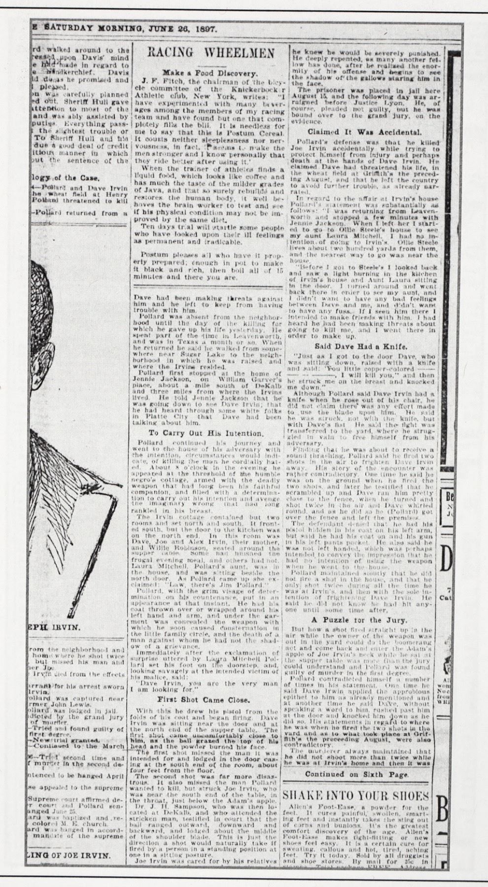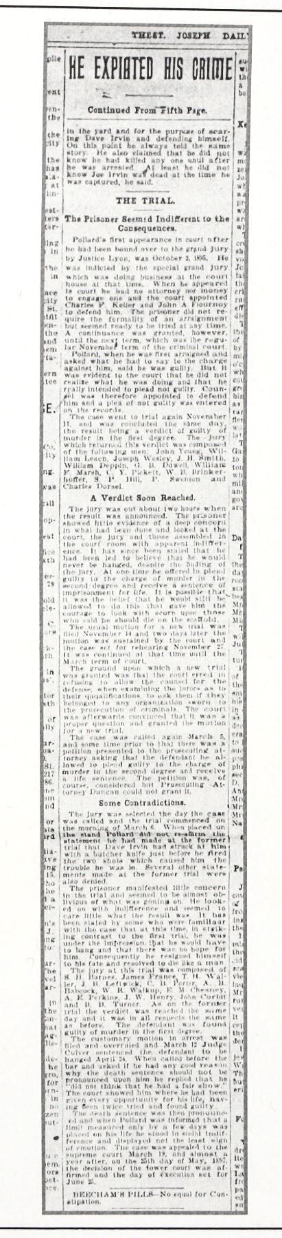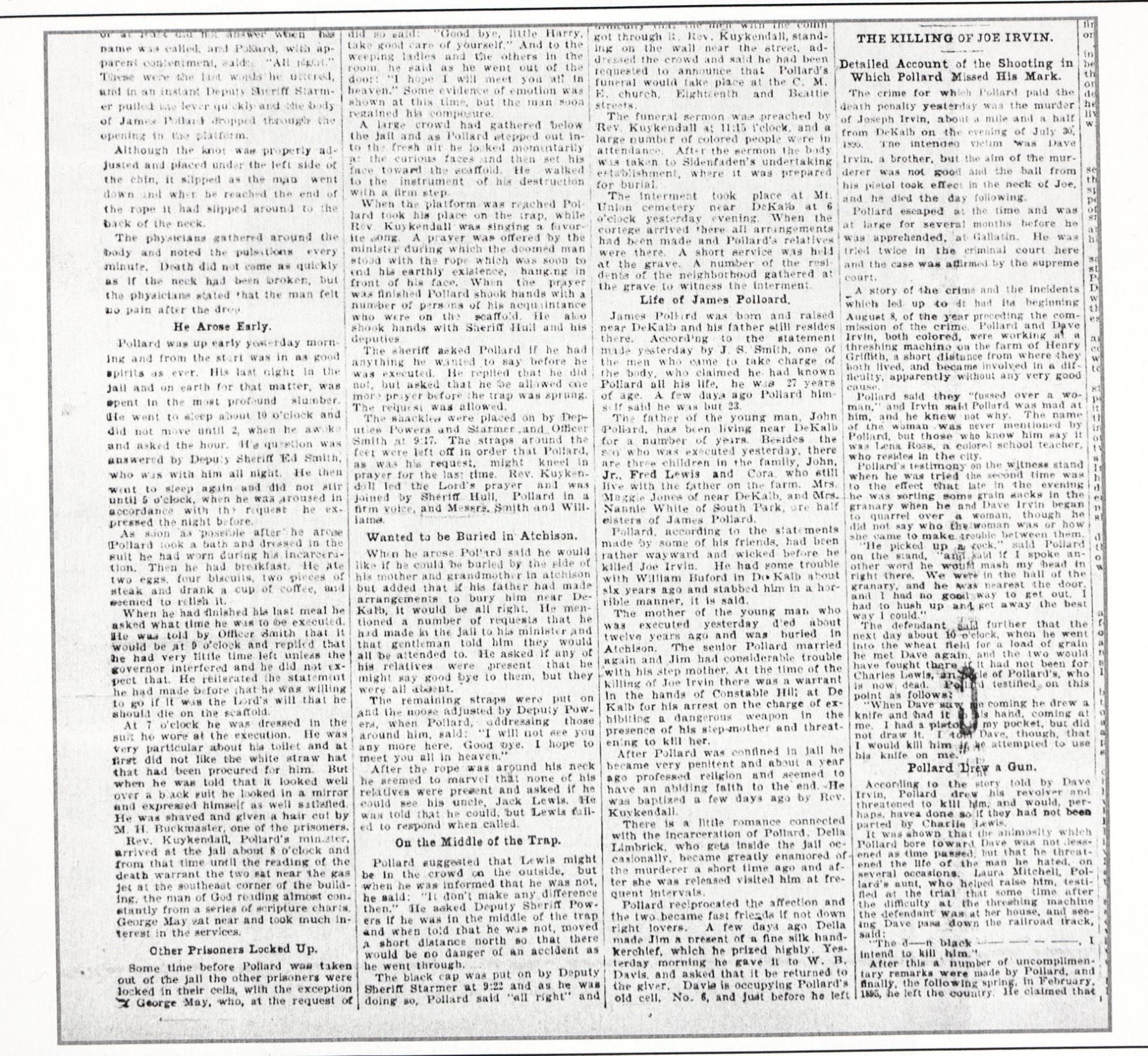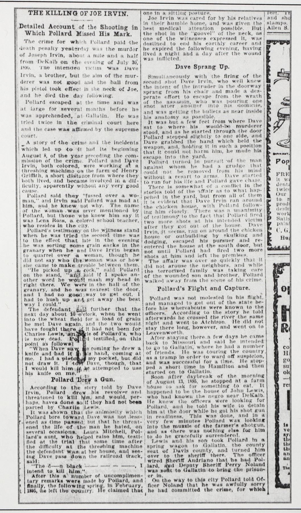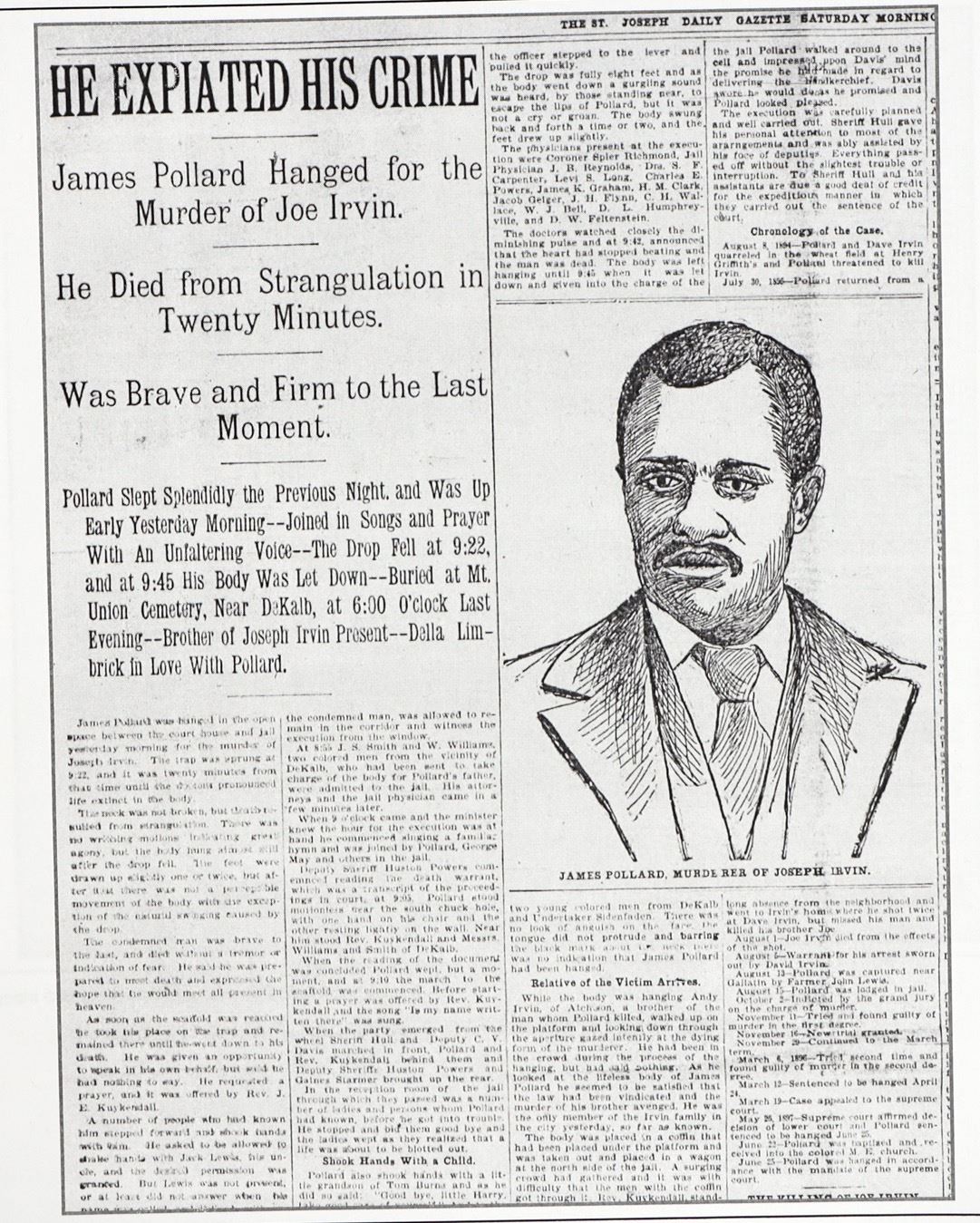 Very rare card to admit JF Owens to the hanging execution of James Pollard, supervised by JB Reynolds, MD , in St. Joseph, June 1897. Pollard, a black man, had accidentally killed Joseph Irwin, another black man, when he was trying to kill Dave Irwin. The bullet had missed Dave and hit Joseph in the neck. He had died the next day. Pollard had escaped the scene of the crime but was apprehended several months later at Gallatin. The pass is signed by James Hull, sheriff for Buchanan County, MO. JF Owen was a jail physician. 2.25 x 4" on cardstock. Comes with newspaper article printouts detailing the crime and execution.