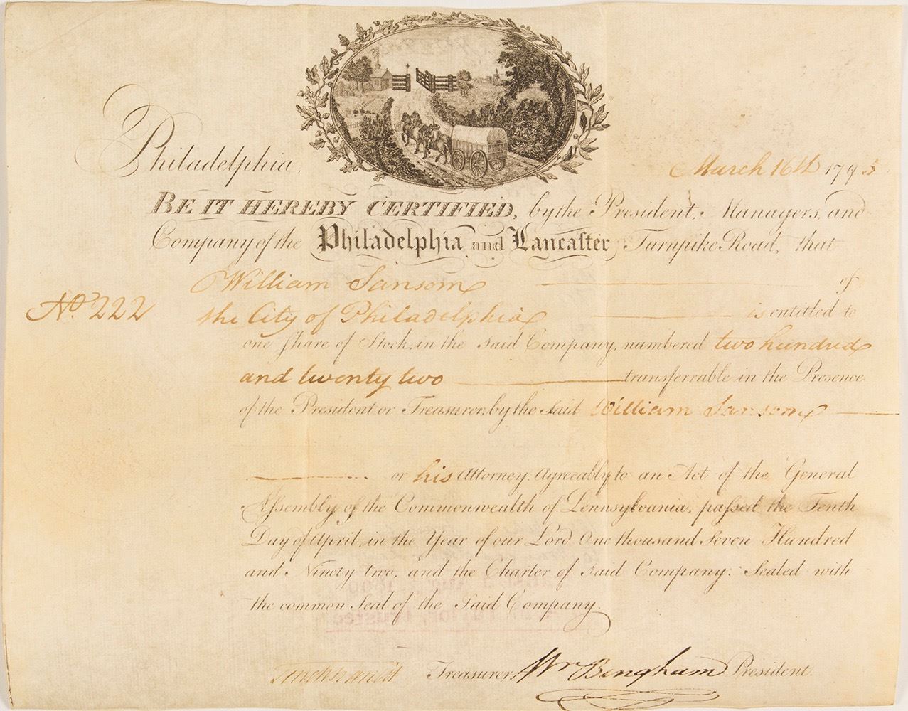 A rare and significant very early certificate. Appears to be on vellum(parchment). #222 issued to William Sansom March 16, 1795. Two vertical folds. 7.5" x 8.5". "Sansom commissioned Thomas Carstairs to build a series of rowhomes on the southern portion of the lot. Dubbed Carstairs’ Row, the 22 homes became the first speculative housing development in the nation. Sansom also used his own money to pave Sansom Street between 8th and 7th streets. This series of 19th-century buildings is now known as Jewelers’ Row in Philadelphia." from philly.curbed.com. The Philadelphia to Lancaster Turnpike, called the Lancaster Pike was built privately as the city could not afford the costs themselves. It was the country's first privately built road with broken stone and gravel. It was the first long distance road in the US. Signed by William Bingham who was a key founder and director of the Bank of North America, the first bank in the country in 1781 and became a Pennsylvania Senator 1795-1781 and one of the richest men in America. With his son-in-law Alexander Baring, he helped broker the Louisiana Purchase. This certificate is a a very early example with a vignette of a carriage and horses with a tollgate. Also signed by Tench Francis was the nation's first Purveyor of Public Supplies.