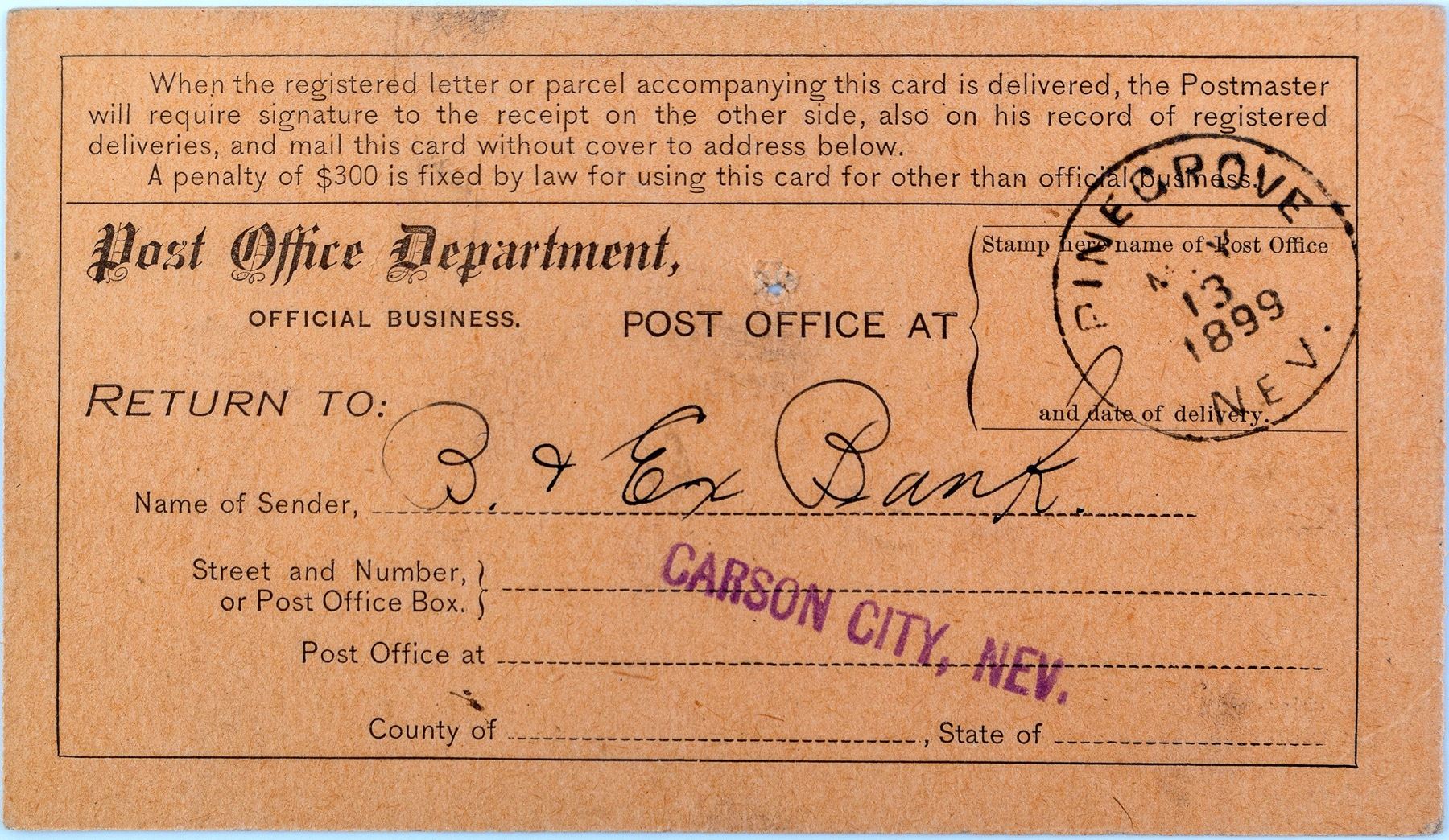 R-5. 1899 on Registry Return card. Post office open from 1869-1912. Some historical information on DE Moore who signed this card. State: Nevada City: Pinegrove HWAC#: 46592 Date: 1899