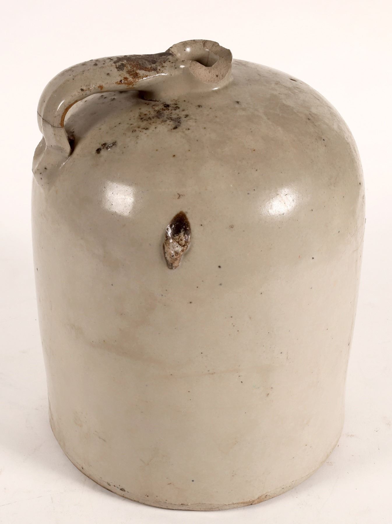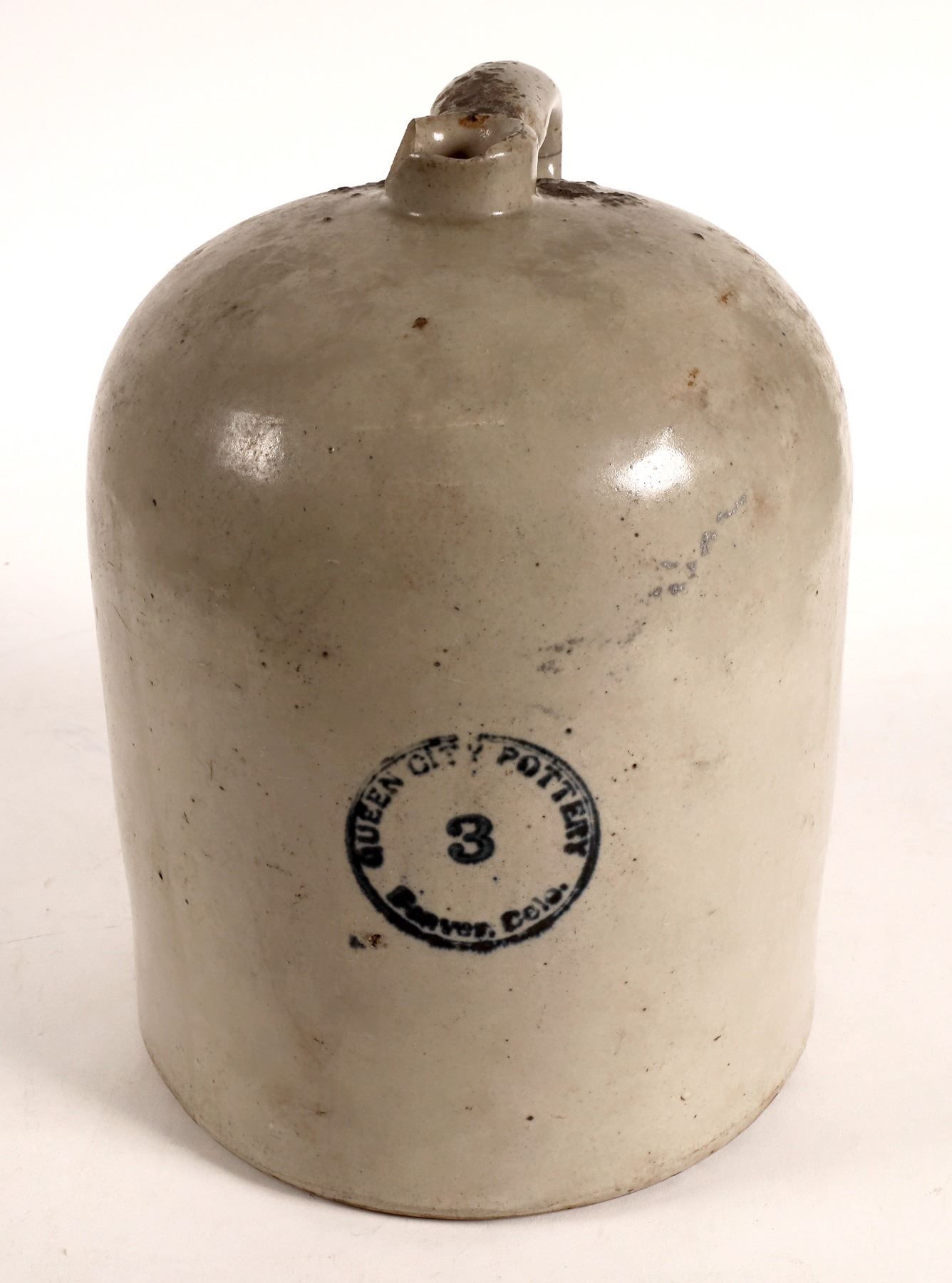 Rare large jug. Queen City Pottery/Denver, Colo. 12.5x9.5". Broken lip, handle crack. Blob on shoulder.