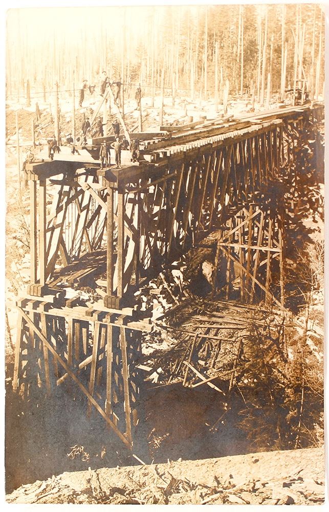 Scarce photo postcard showing 14 men posing at the end of a railroad bridge in construction in a heavily forested area. Reverse has message written in faint pencil from a man to his sister telling her they should be done in a week and then he can come home. 1911 Matlock cancel. Choice lumber industry related card! (Prag Collection) Date: 1911 Location: Matlock, Washington HWAC# 55473