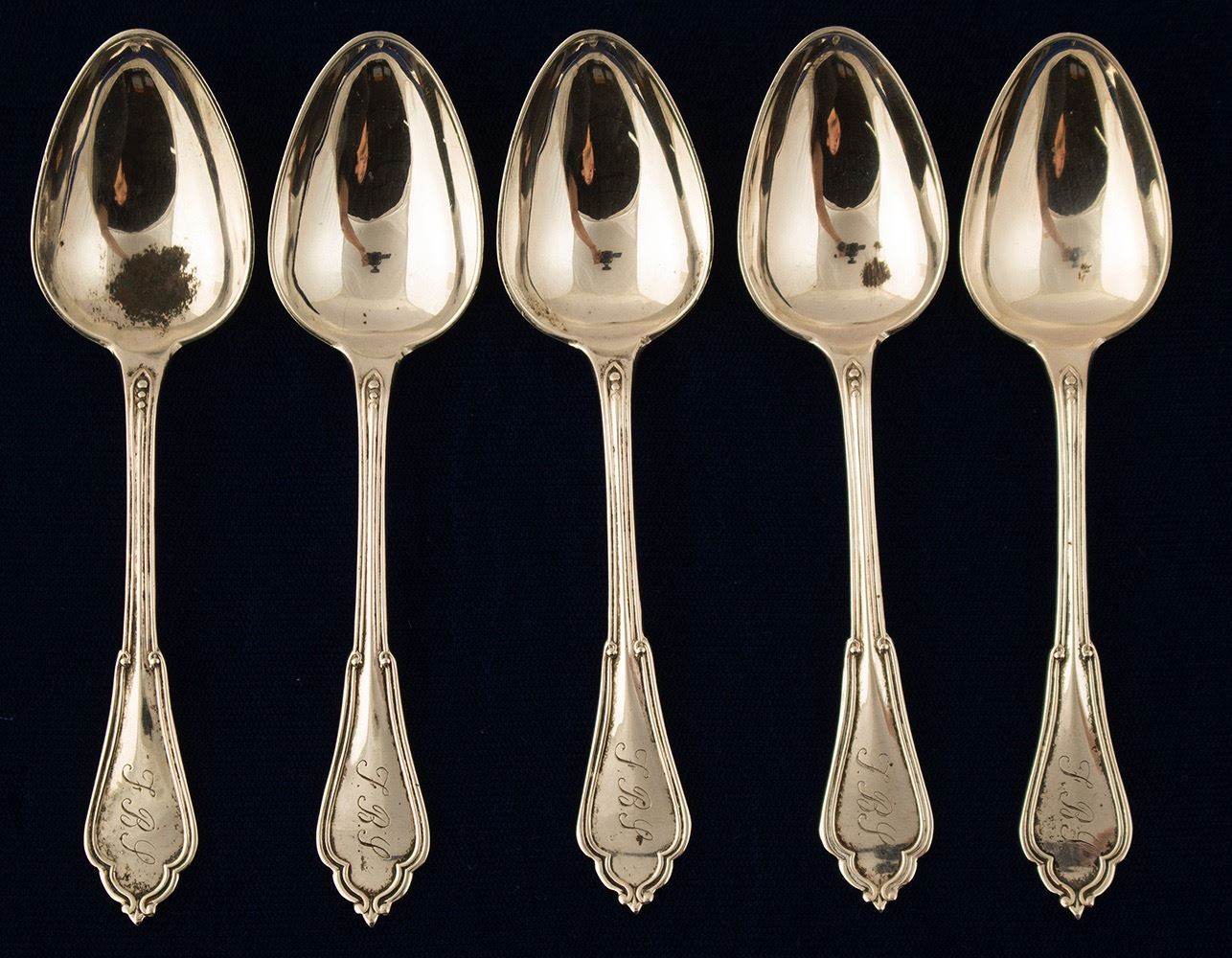 Five matching small silver spoons marked F. R. Reichel, S.F. (San Francisco). Reichel was an early San Francisco Silversmith at 620-622 Merchant. His silver pieces are very rare today. We have not found him involved in the assay business, which was customary for the gold rush silversmiths. Circa late 1850's to early 1860's. Date: Location: San Francisco, California HWAC# 49149