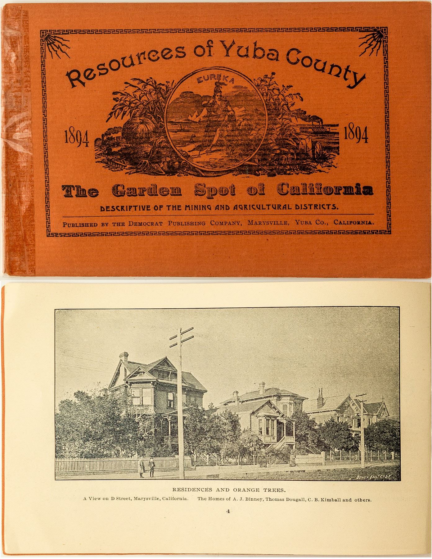 Compiled by T. J. Sherwood. Descriptions of Olive Hill, Smartville, Marysville, Wheatland, Comptonville, etc. 19 full page sketches. Six portrait sketches. About 15 pages of advertisements - most are pictorial. Some pages are still connected do to printing process. Cover coming loose and has been taped. 56 pages. 5.5 x 8.75". State: California City: Yuba County HWAC#: 48405 Date: 1894