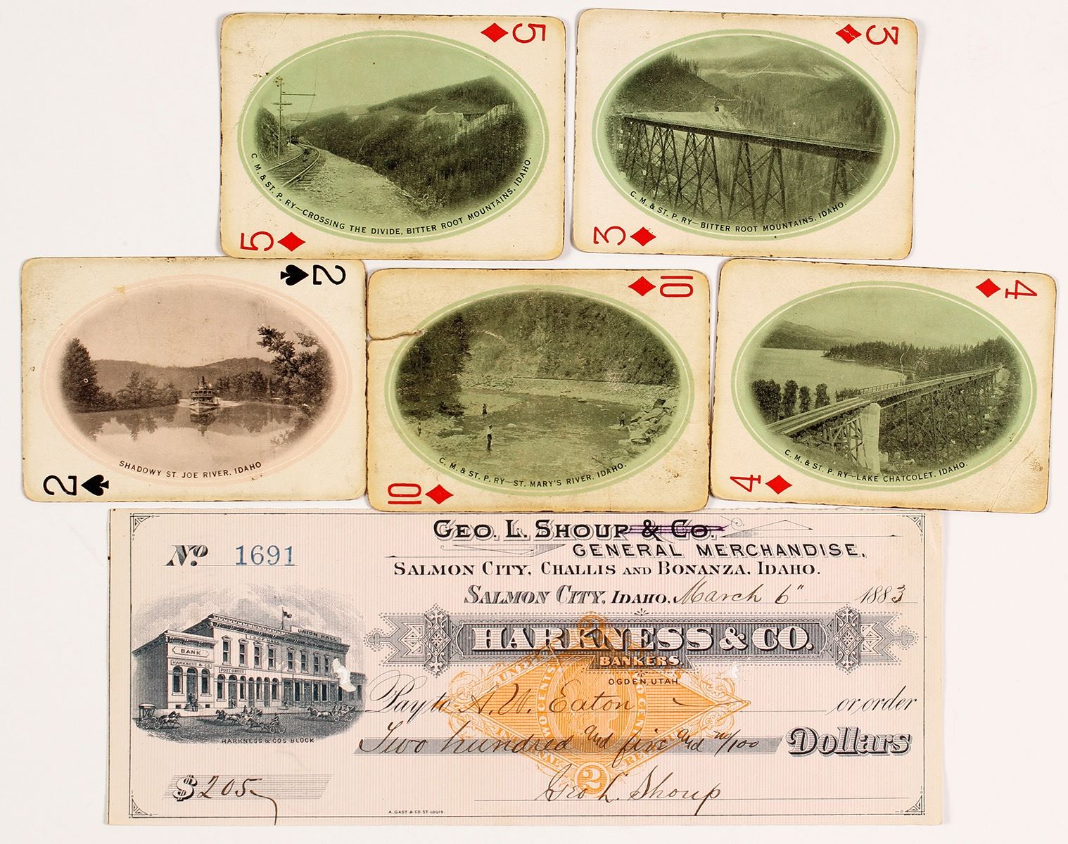 Lot of 6. 1) Rare 1883 Harkness & Co. Bankers revenue check, Salmon City, Idaho, March 6, 1883. Vignette of bank at left. Geo. L. Shoup & Co., General Merchandise, Salmon City, Challis and Bonanza, Idaho. RN-G. 2) Five railroad playing cards with Idaho scenes (Bitter Root Mountains, St. Mary's River, Lake Chatcolet, St. Joe River). Four are C.M. & St. P. Railway. One is Electric Railway. (Prag Collection) Date: Location: Salmon City, Idaho HWAC# 55622