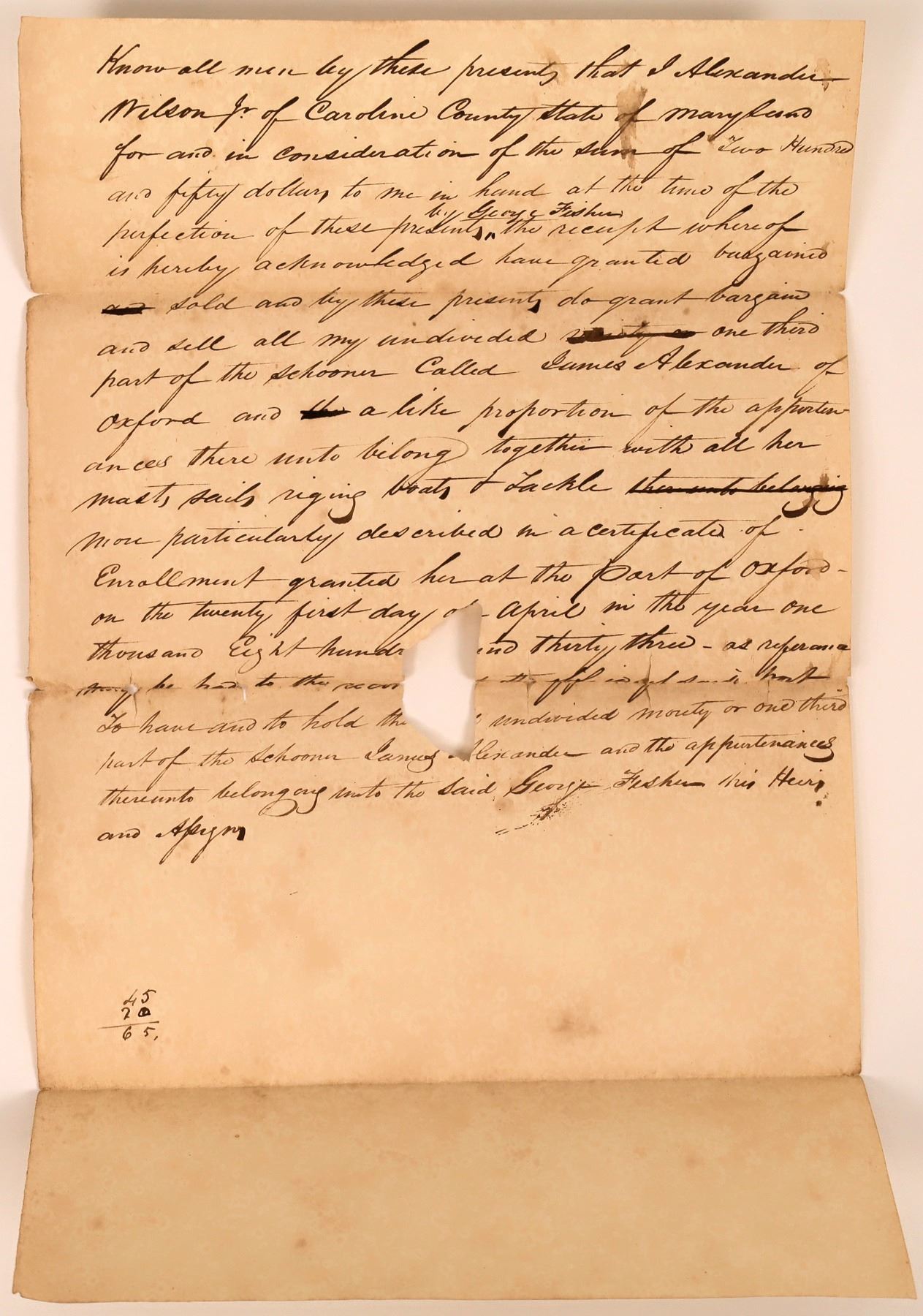 George Fischer sold 1/3 interest in the schooner 'James Alexander of Oxford' to Alexander Nelson Jr. of Caroline County, Maryland. Includes details of the sale. Oxford was laid out in 1683 and served as a port of call for vessels from all over the world. Large hole in center, but does not affect the readability of the letter.
