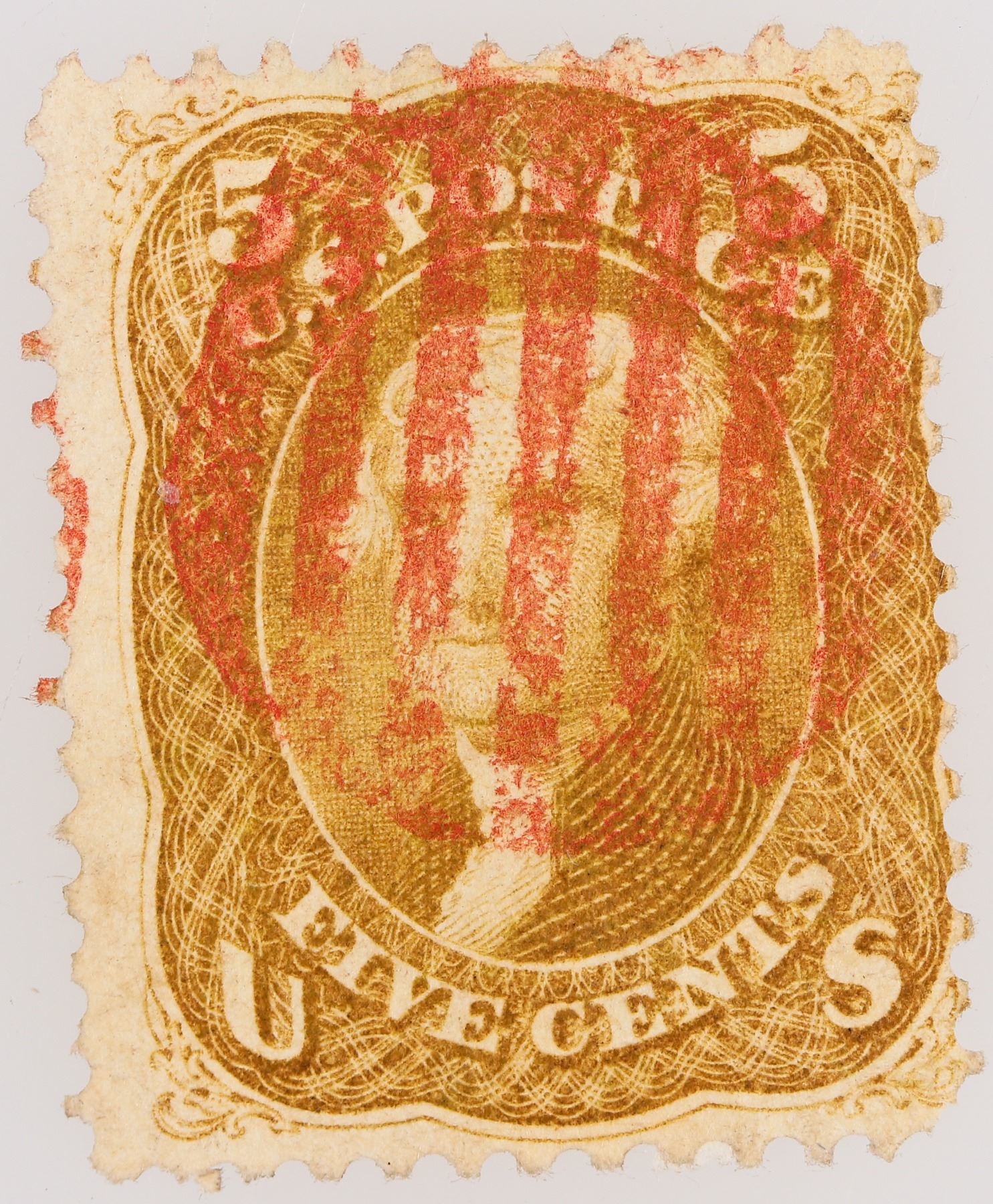 Scott #67A, Washington 5c stamp, brown-yellow. Rare stamp. Poorly centered. Red circle/line cancelation mark. See photo.