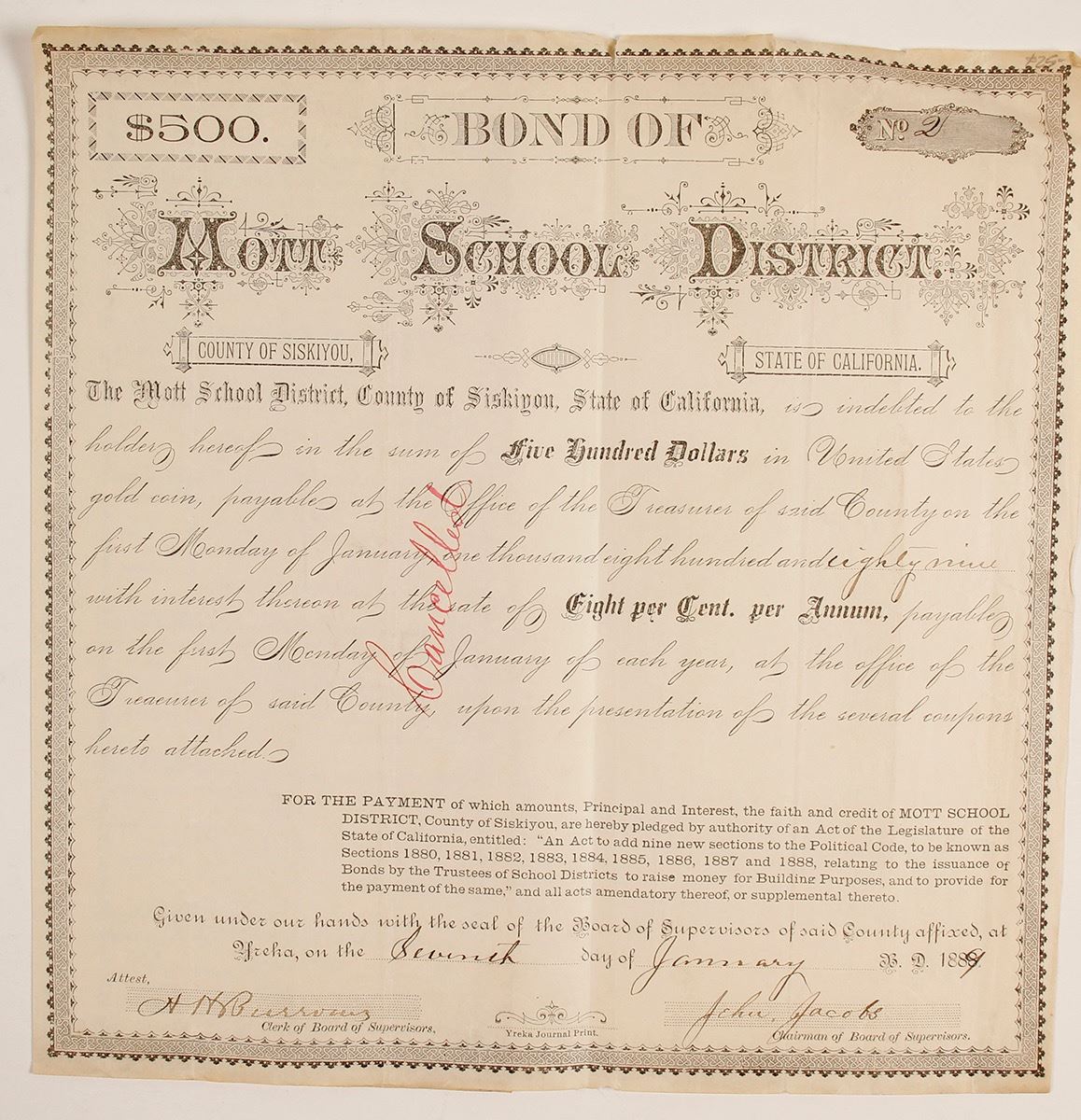 Mott School District. $500 #2 i/c 1889. Top creasing and small seam tear. Date: Location: Siskiyou, California HWAC# 65071
