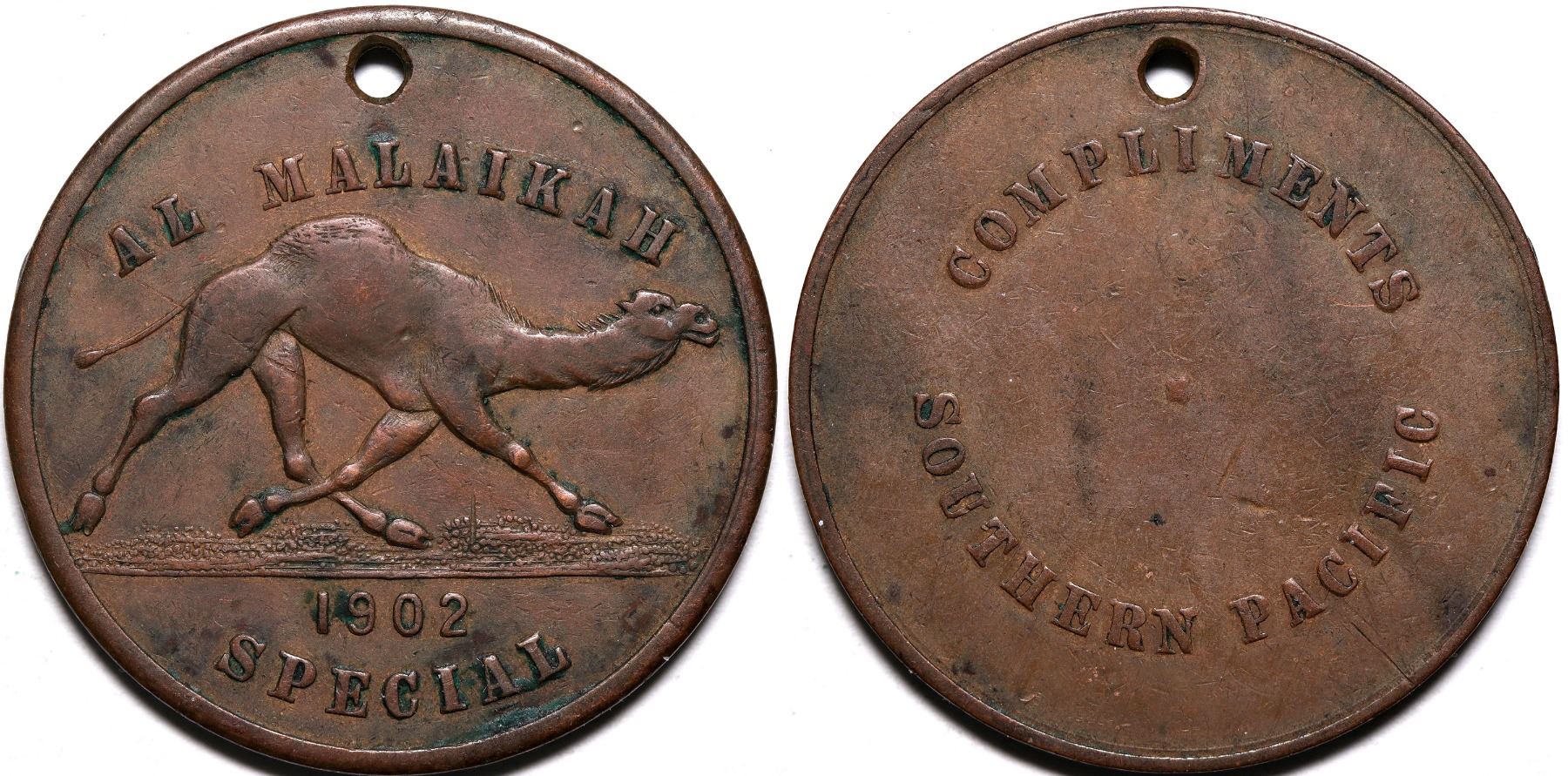 Obv.: Al Malaikah / (pictorial camel) / 1902 / Special; Rev. : Compliments / Southern Pacific. Br., rd., 33 mm, holed. The local executive Committee engaged a special train for Al Malaikah Temple "which will be the finest ever run across the continent." Seven magnificent new Pullmans of the latest style will carry about a hundred of the Los Angeles fezwearers. The Special ran to Saratoga New York for the national convention.