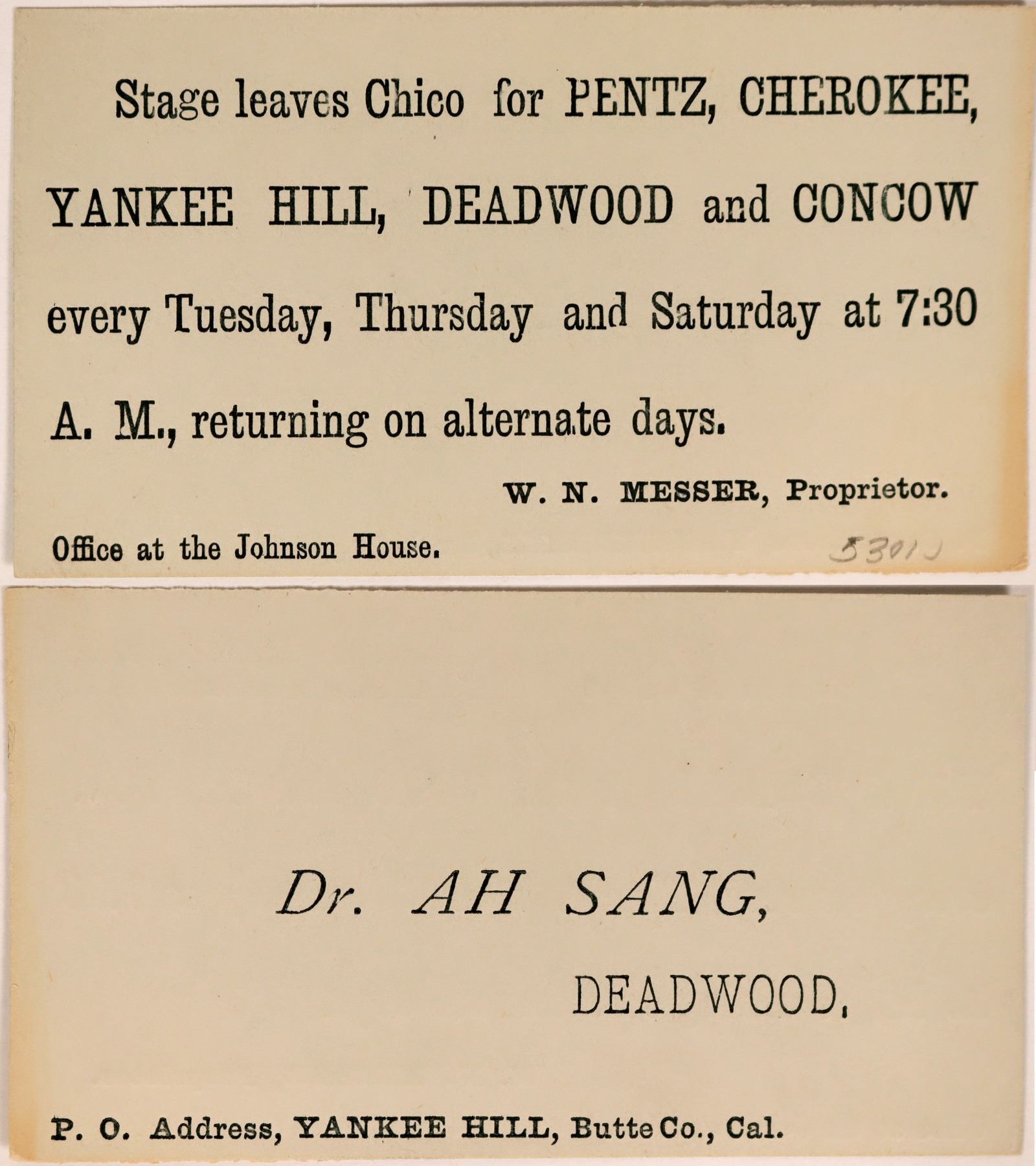 Grey cardboard card, 4 x 2 1/4 inches. Obverse: Dr. AH SANG, / Deadwood, / P.O. Address, YANKEE HILL, Butte Co., Cal. Reverse: Stage leaves Chico for PENTZ, CHEROKEE, YANKEE HILL, DEADWOOD and CONCOW every Tuesday, Thursday and Saturday at 7:30 A.M., returning on alternate days. W.N. Messer, Proprietor / Office at the Johnson House. Ex: Ron Lerch Collection.