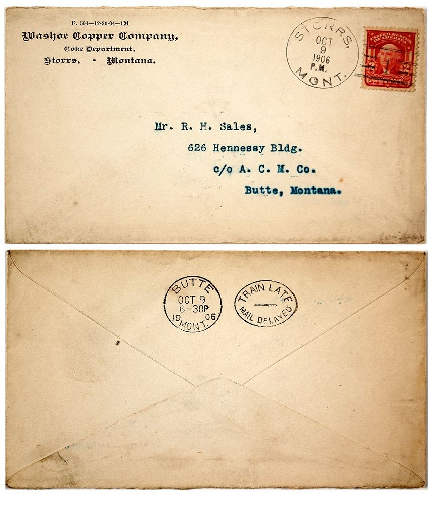 Post office open from 1904 to 1908. Very nice strike. Has a Washoe Copper Company corner advertisement. And if that weren't enough, back is stamped, "Train Late / Mail Delayed" City: Storrs State: Montana Date: 1906 ID: 37028
