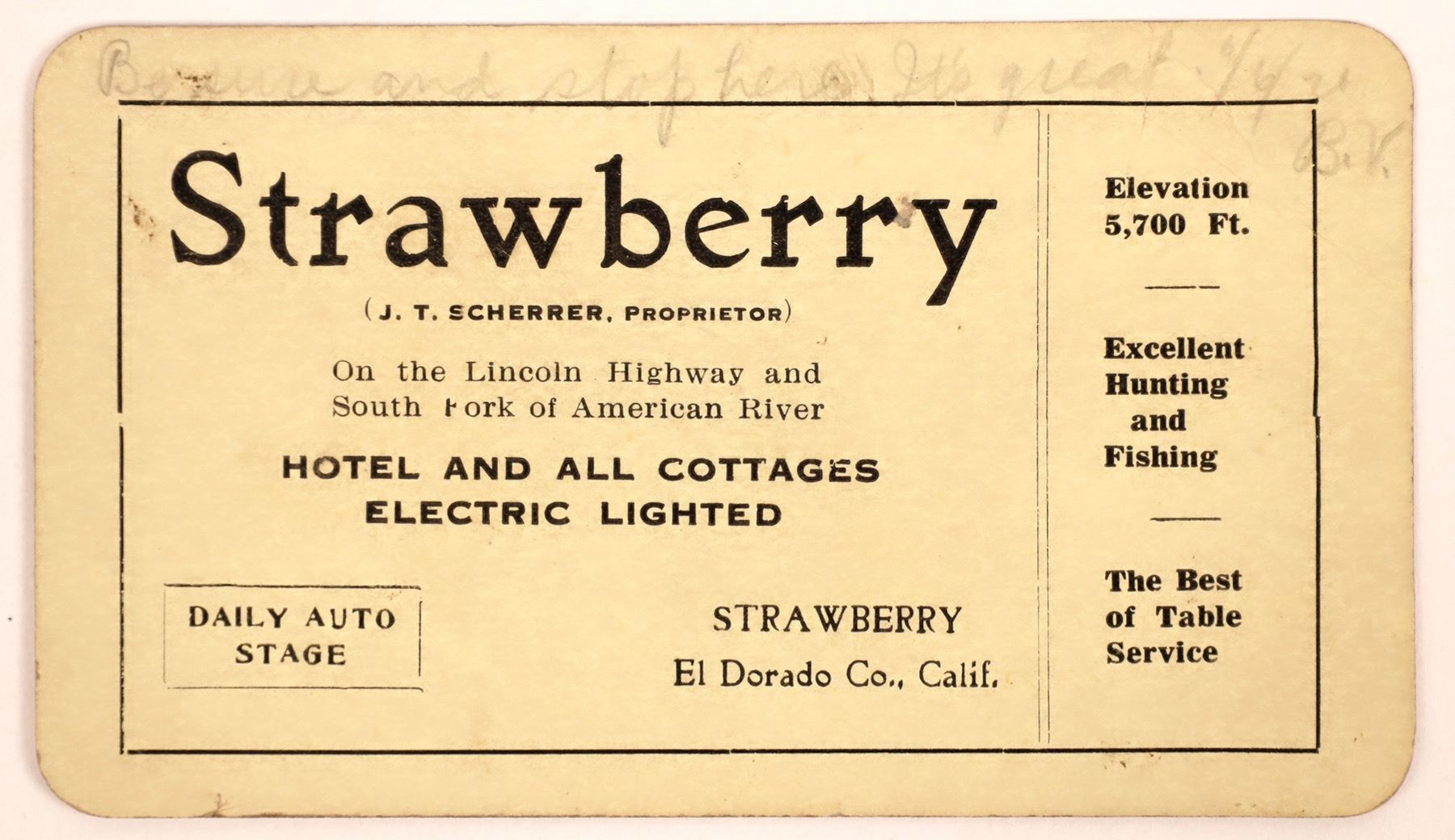 Very rare business card for Strawberry Hotel, JT Scherrer, Prop., with Daily Auto Stage, Electric Heating, and Excellent Hunting & Fishing. Located along the American River outside of the Tahoe Basin. Reverse has distances for places along Lincoln Highway from Placerville to Tahoe to Reno. Light green cardstock. The Strawberry Valley area was a stage stop and toll house operated by George Swan in the 1860s. The Strawberry Hotel almost burned down in the 2021 Caldor fire.