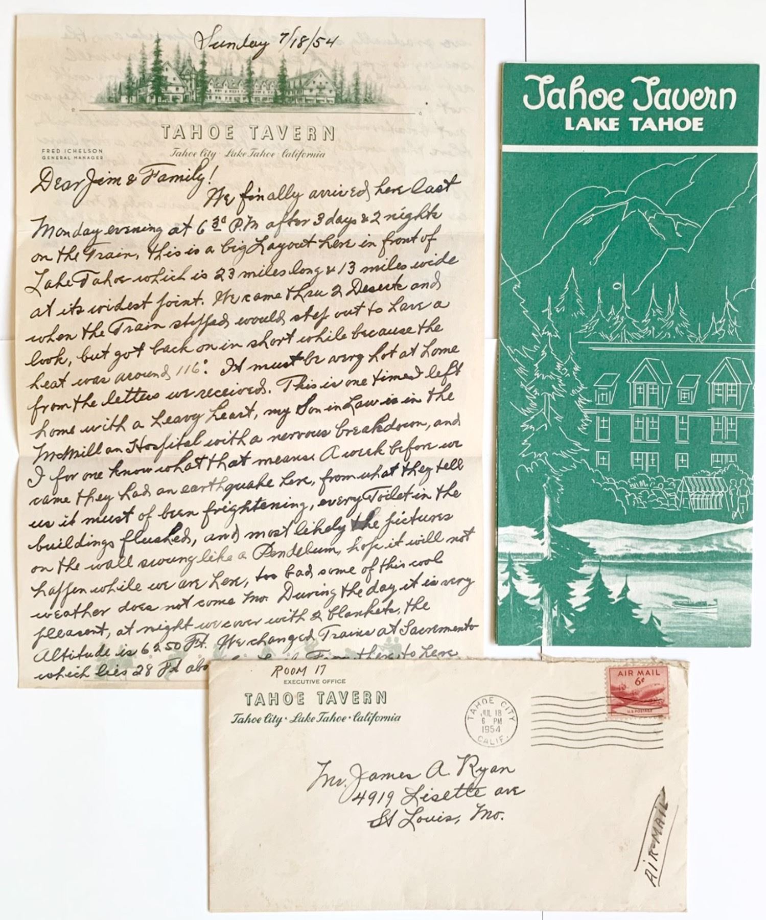 Lot of 3. 1) Fantastic pictorial letterhead with cover. Message sent July 1954 and details trip to Tahoe. Great vignette of Tahoe Tavern in the trees. Fred Ichelson, general manager. Cover is corner ad. Sent Air Mail. 2) c.1930s highly illustrated brochure for the Tahoe Tavern. 4 panel. Shows numerous activities including golf, swimming and horseback riding. 9 x 4" Green print.