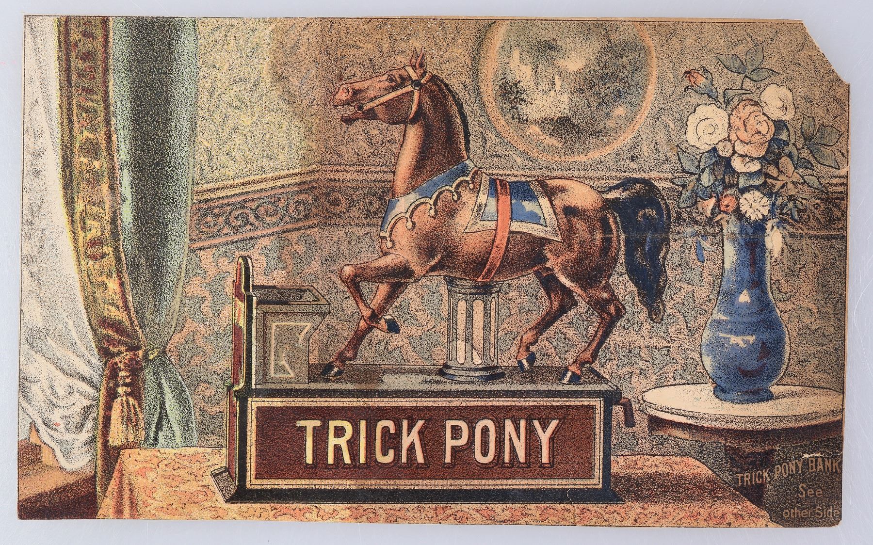 Rare trade card for the "Trick Pony" Toy Savings Bank made by Wm. Blair & Co. in Chicago. Picture of the bank on the front side of the card. 5 x 3 inches. Good condition, top right corner is torn off.