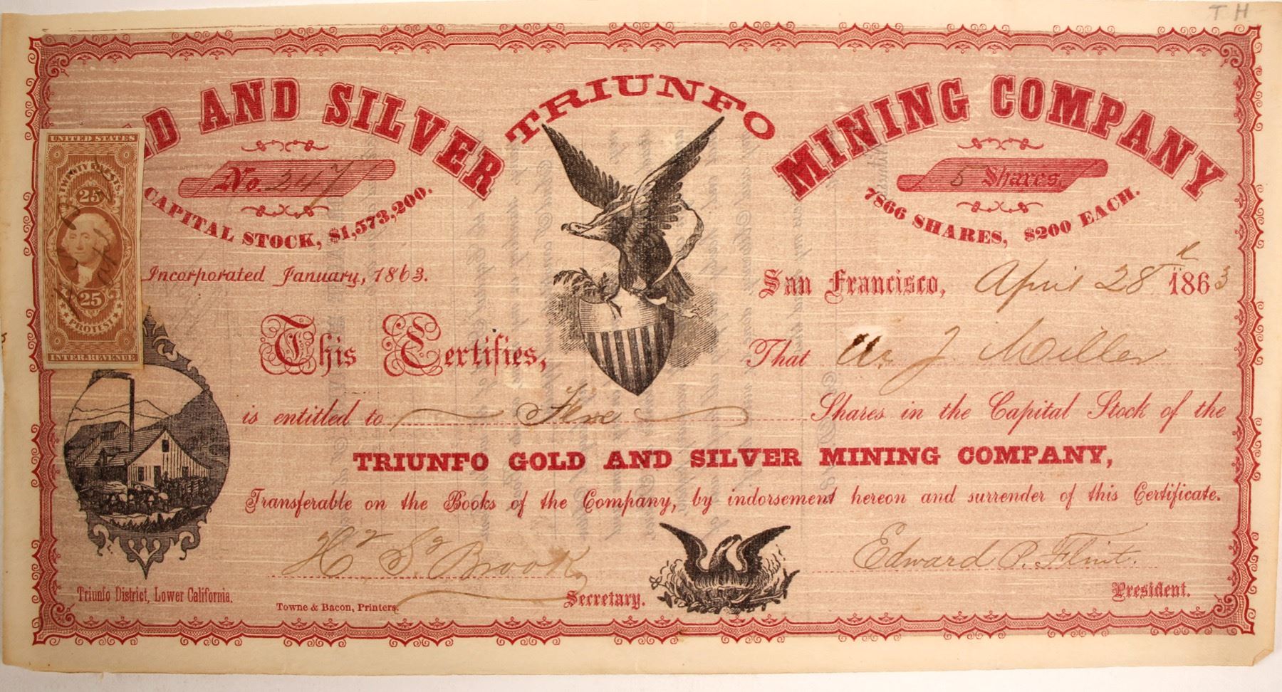 Very rare red printed, issued 1863 to Willer? #247 5 shares. State: California City: Baja Date: HWAC# 56155