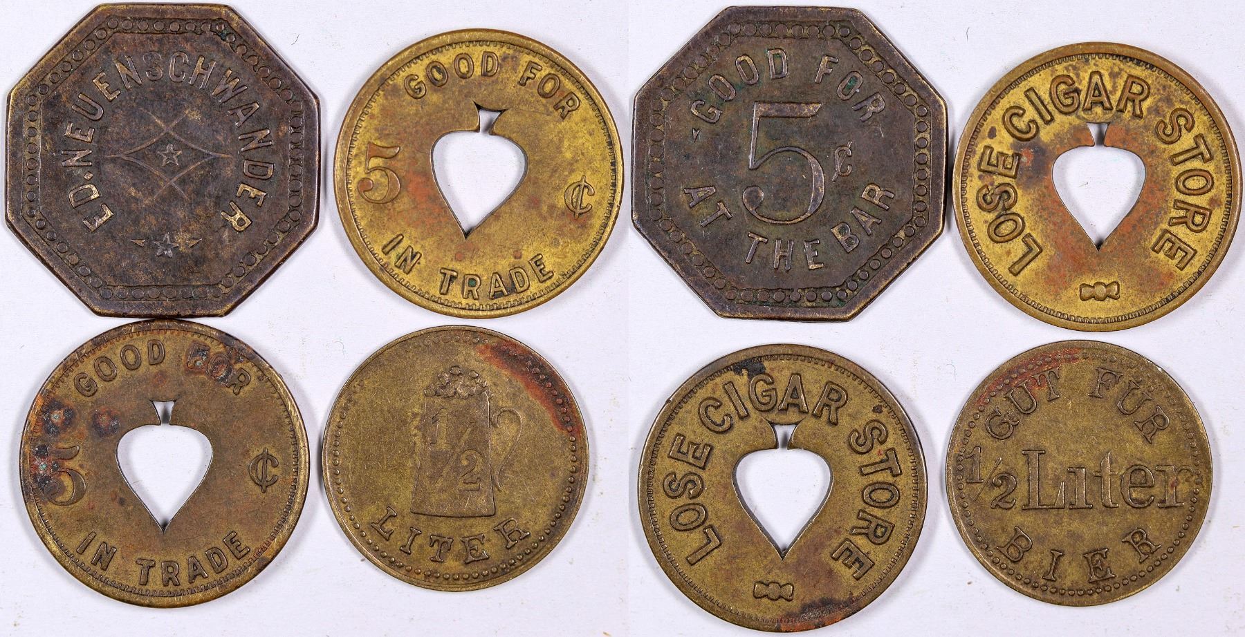 Lot of four mavericks: one gut fur 1/2 liter bier; Ed. Neuenschwander; G.F. 5c At The Bar; Br., octagonal; two from Lose Cigar Store, unlisted varieties for Decator, Indiana.