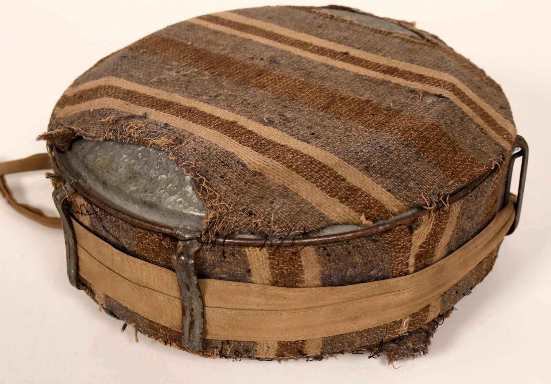 This is a nice old desert canteen, like the ones you would see in that great film classic "The Treasure of Sierra Madre." The piece measures about 13"x 4" and still has much of its insulated covering. A vintage piece.