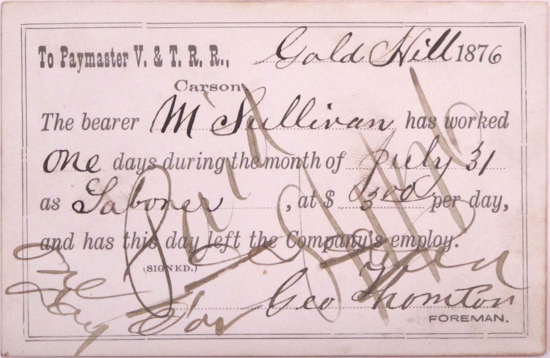 Dateline Gold Hill, 1876. Pay M. Sullivan for one day of work as a laborer ($3). Signed by foreman Geo. Thornton. Marked Paid. Reverse says "Sect. 14 Gold Hill." 2.5 x 4" Printed on cardstock. Some smudges. Date: 1876 Location: Gold Hill, Nevada HWAC# 63082