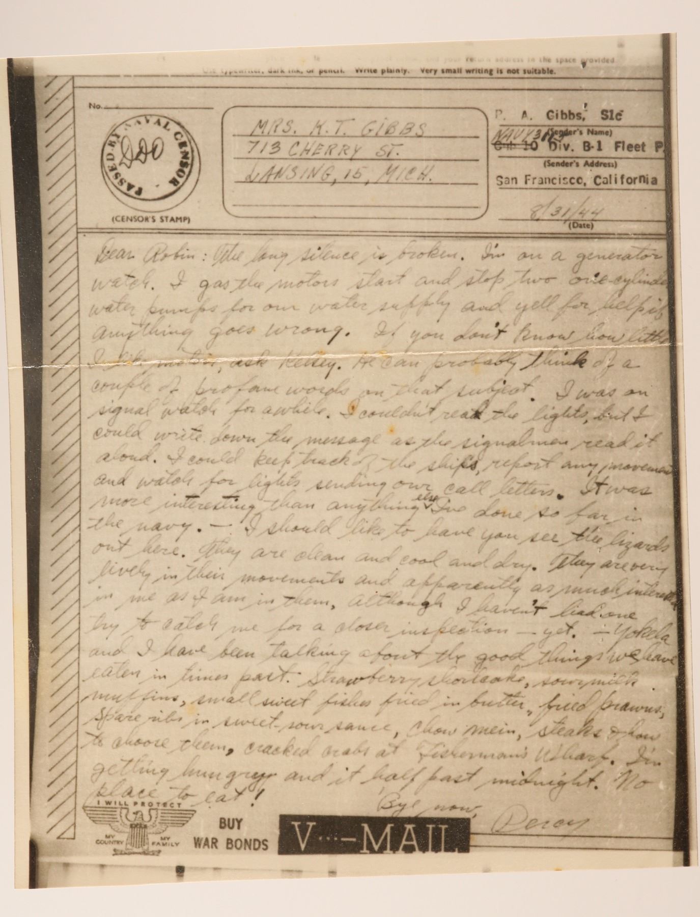 1944 photographed Navy letter about duties and meals. Letter is photographed for small V mail envelope.