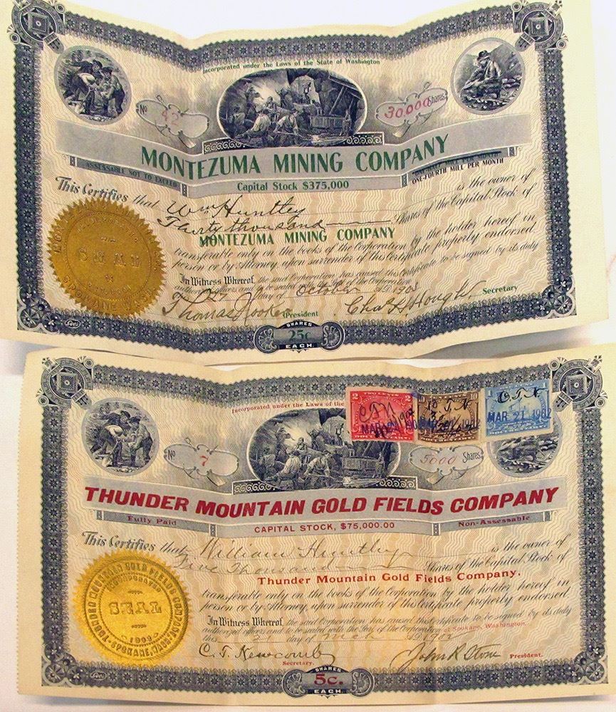 Two Washington mining stock certificates: 1) Thunder Mountain Gold Fields Company, no. 7, 5000 shares, 1902. Issued to William Huntley. Signed by John R. Stone, president and C. T. Kewcomb, secretary. revenue stamps. 2) Montezuma Mining Company, no. 42, 30,000 shares, 1903. Issued to Wm Huntley. Signed by Thomas Hooker, president and Chas. H. Hough, secretary. We have never seen these certificates before. Collectible. Date: c.1900's Location: Washington HWAC# 56854