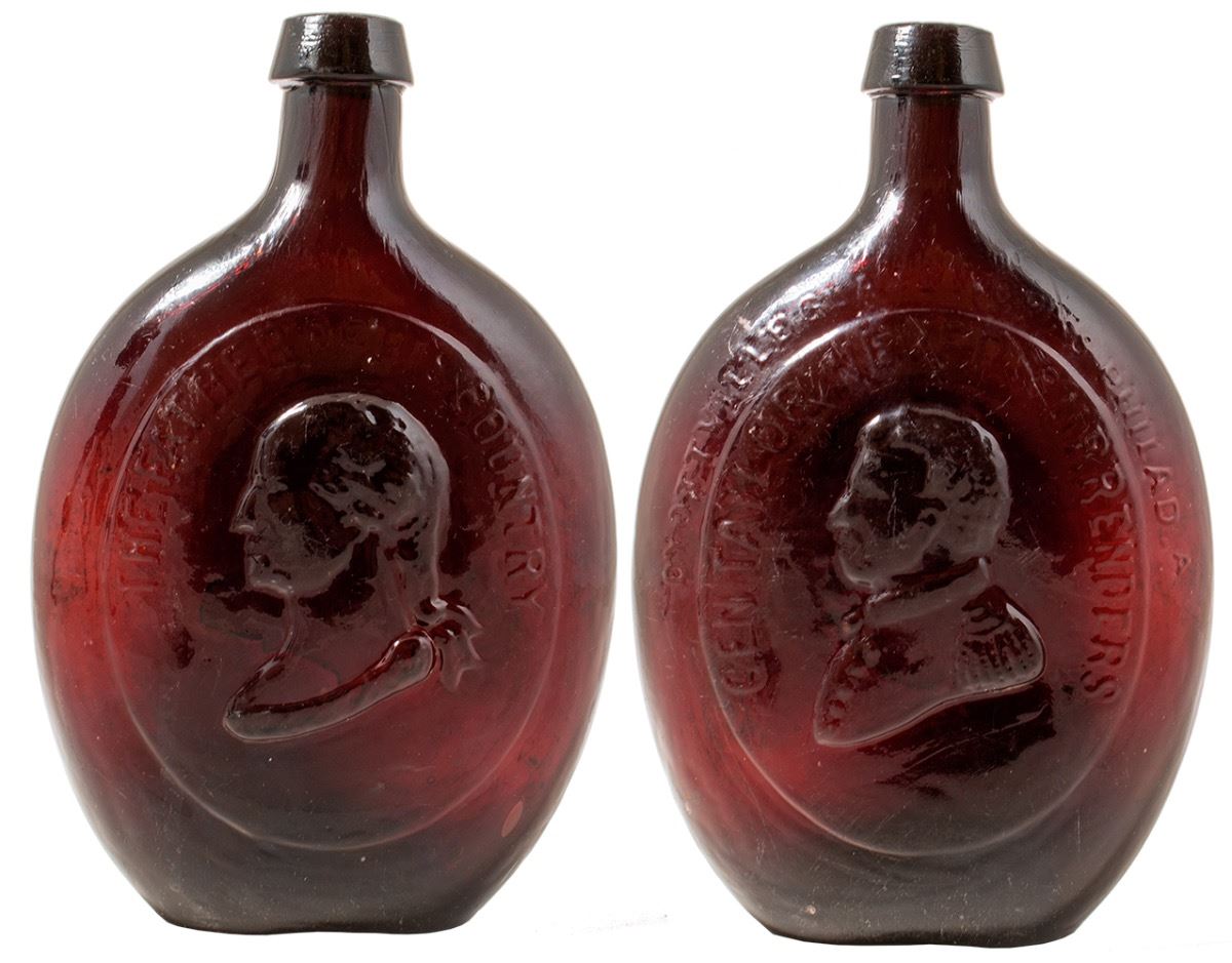 Rare Washington Taylor whiskey flask in deep puce/purple. Open Pontil. Slope shoulder applied top. 7.5" tall, 4.5" wide, 2" deep. "The Father of His Country" with large image of Washington. The other side "General Taylor Never Surrenders" with large image of Taylor. Also, written above the oval of Taylor "Dyottville Glassworks Philada". The bottle has spectacular color, with an incredibly deep puce color, and apparent heavy whittle. This bottle is new to the collecting universe. It was discovered in one of the Northern California gold camps. It has some surface wear, but has never been handled by a professional bottle conservator. For those of you who are also gold miners, you have seen this bottle before. It was on display at Cinnabar Sam's Grill in Willow Creek, California for 25 years, from 1988-2012. Willow Creek is a wonderful little mining camp on the Trinity River about 30 miles inland from Eureka/Arcata. It is also the “Bigfoot” capital of the west. City: Philadelphia State: Pennsylvania Inventory Number: 38158