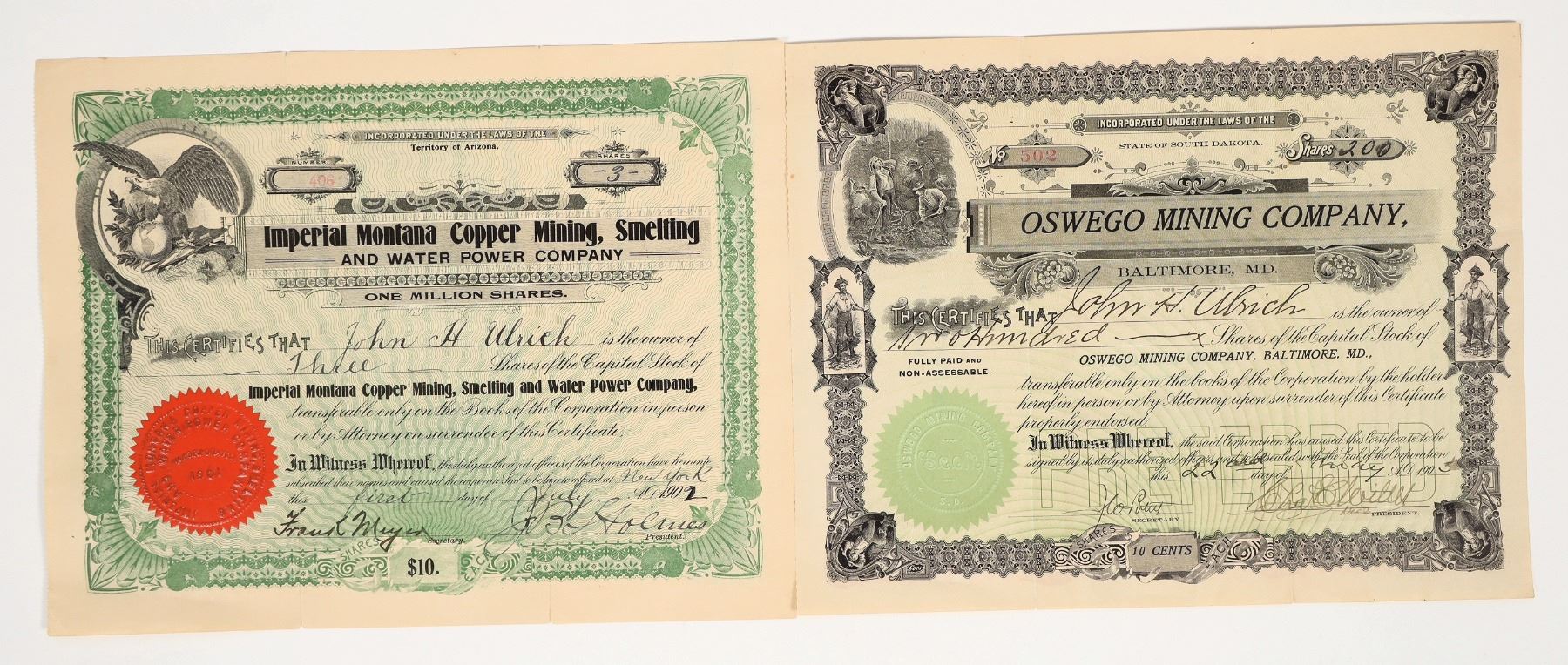 A pair of rare mining stocks from the western United States, both issued to John H. Ulrich. Lot includes a certificate from the Imperial Montana Copper Mining, Smelting and Water Power Company (#406, dated 1902); and a certificate from the Oswego Mining Company (#502, dated 1903). Both certs are signed by secretary and president w/ embossed seal, both uncancelled. Nice mining vignettes on the Oswego cert. These are some rare finds; we've never seen pieces from these companies at Holabird Americana before.