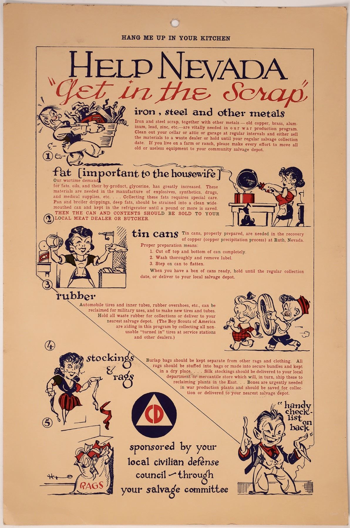 Two-sided. "Hang Me Up in Your Kitchen." Lists all the ways people can Help Nevada in the war effort, such as donating: iron, steel, and other metals; fat; tin cans; rubber; stockings and rags. Red and blue print and illustrations. Reverse lists more ways to help. Block leader of the local Defense Council is listed as Alma V. Johnston. Printed by Union Label. 14.5 x 9.5"
