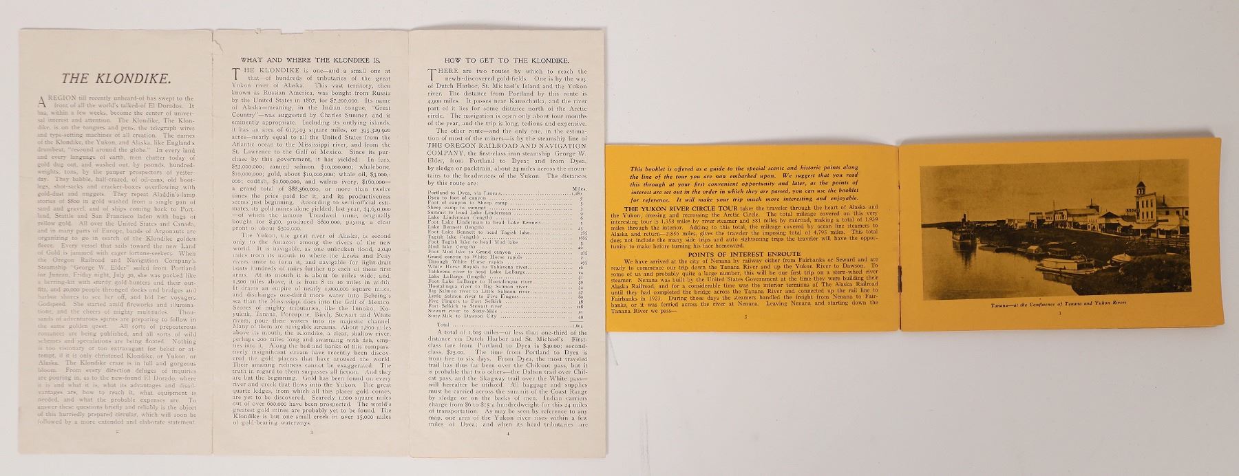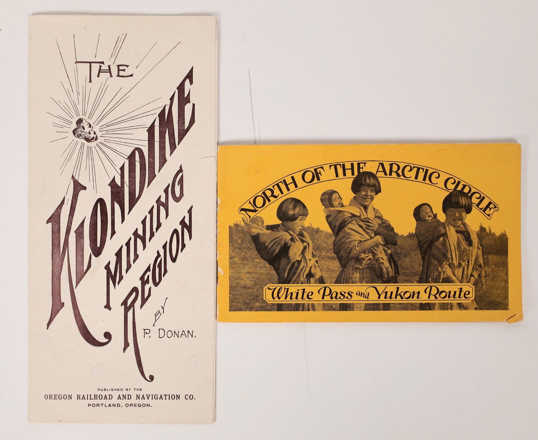 2 rare Yukon Territory pamphlets. North of the Arctic Circle, White Pass and Yukon Route, illustrated, 40pp. Klondike Mining Region by P Donan, 8pp, includes info on Oregon Railroad and Navigation Co., 1" seam tear. Yukon Territory