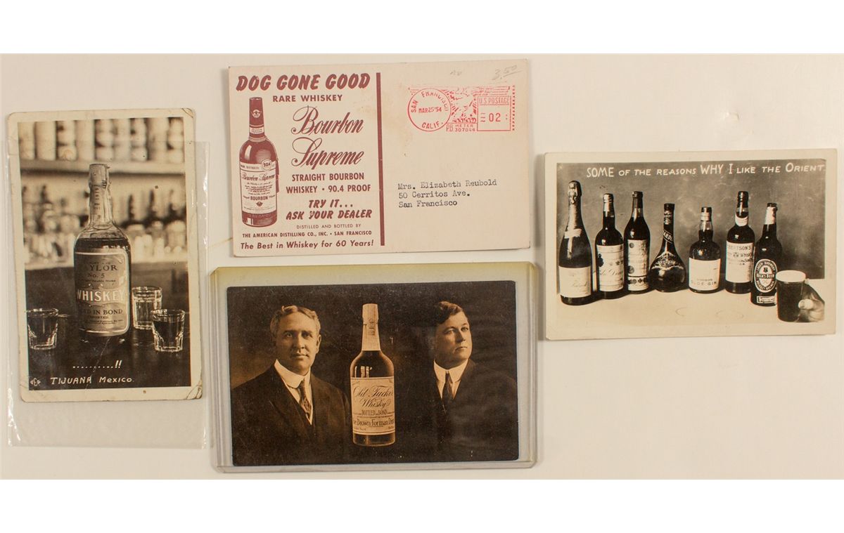 From the Ken Prag collection 4 rare whiskey related postcards. 1 Old Tucker whiskey ad. 1 Wright and Taylor. 1 Bourbon Supreme ad (out of San Francisco). 1 photo postcard of various liquors.