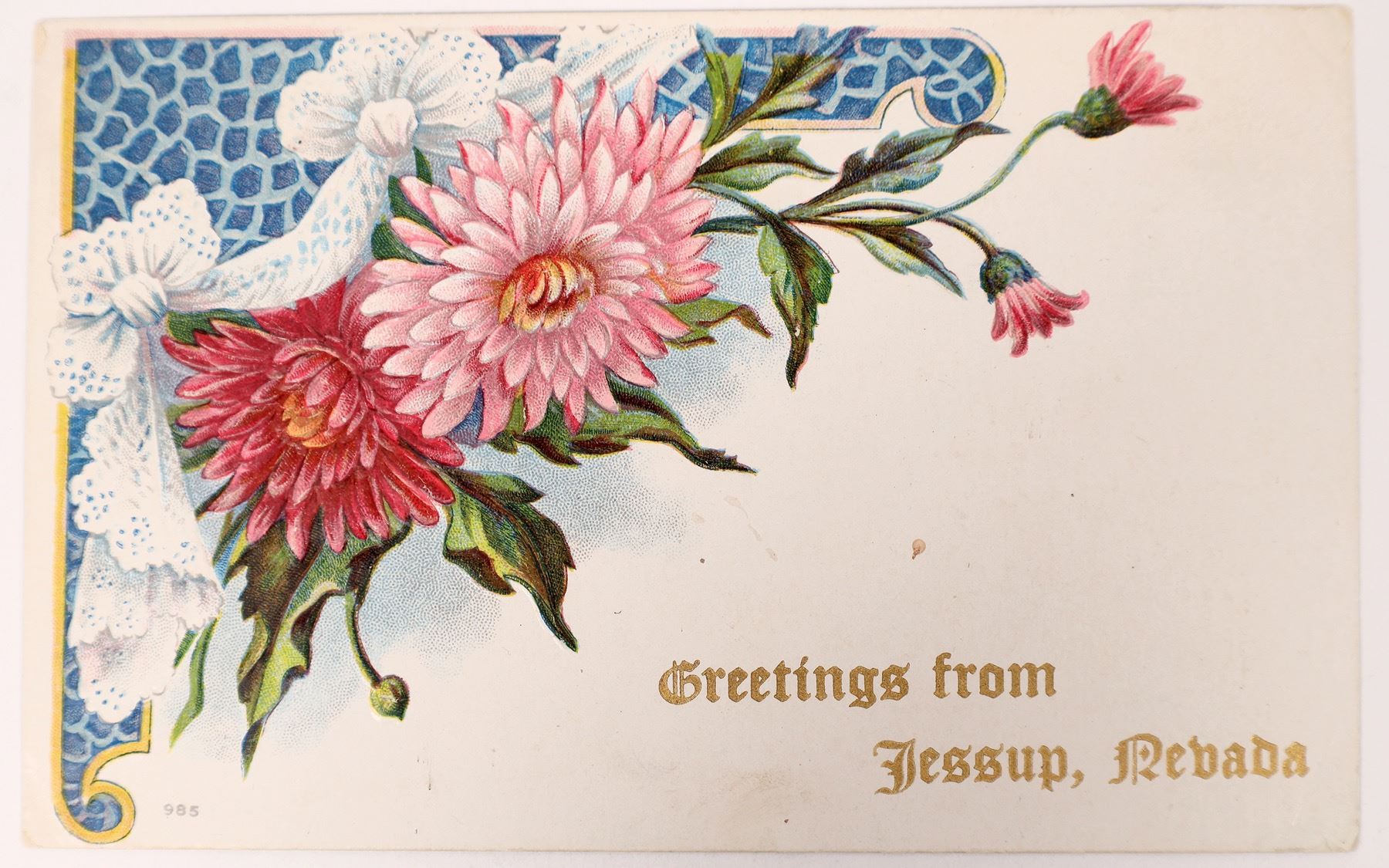 1909. Rarity-9. Weak strike with the top cut off although Jessup can clearly be deciphered. This is the earliest confirmed Jessup postmark. Obverse of postcard is flowers with "Greetings from Jessup, Nevada."